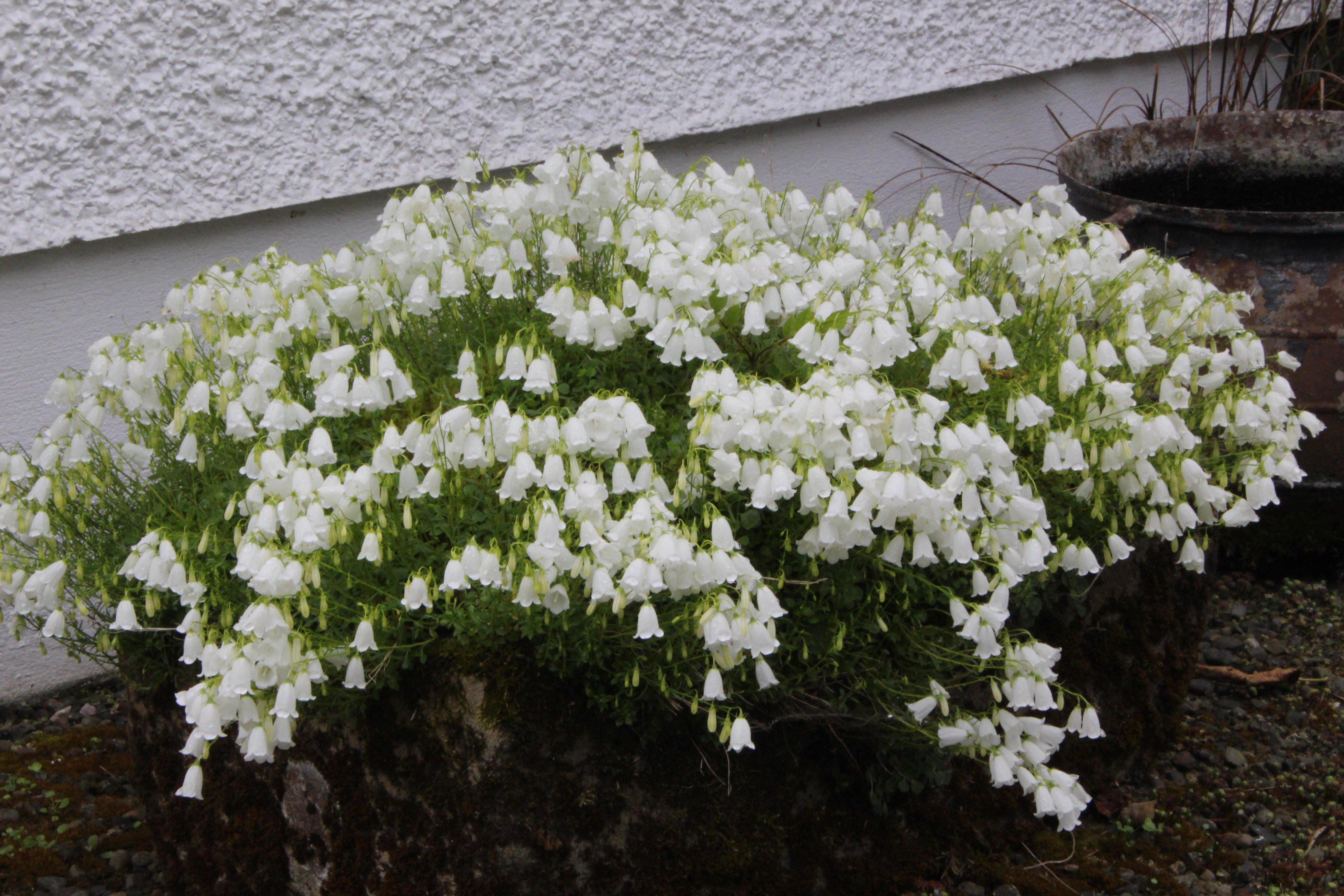 Campanula cochlearifolia var. alba is a creeping rhizomatous perennial to 10cm tall, making a compact mat of small, rounded leaves, with bell-shaped white flowers in summer. This has been a a trough for over 20 years in front of our house. I don't we've we've done anything to it. Tough!