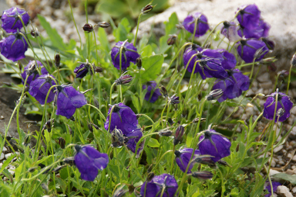 Campanula are late spring and summer flowering perennials that prefer partial sun - but many will tolerate deep-shade and full-ish sun. They grow well in a variety of soils - almost anywhere that isn't too extreme. Campanula usually produce bell-shaped flowers that attract all sorts of wildlife. This feature is so emblematic, that plant taxonomists have even coined the word "campanulate" to mean any bell-shaped flower (note also that Campanula is Latin for "little bell"). However some species of Campanula have 'split-open-type' bell flowers which may start life looking bell-like but soon don't look like bells at all (unless you folded them and glued them together in some origami style).