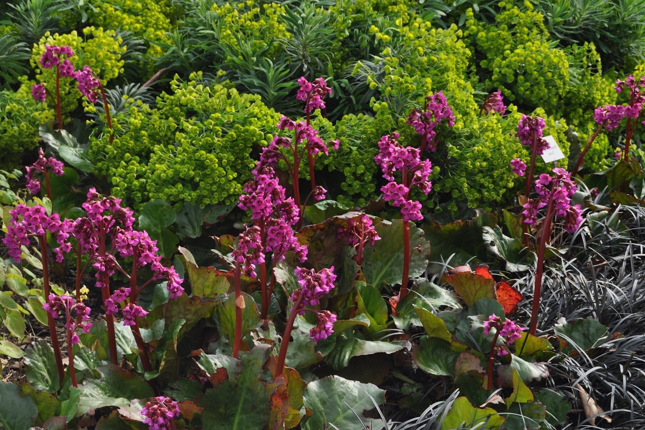 Bergenia 'Eroica' has vivid purple-pink flowers on tall, branching, colourful stems, held above bronze-green leaves that redden in winter. A very floriferous cultivar with good frost-resistance.