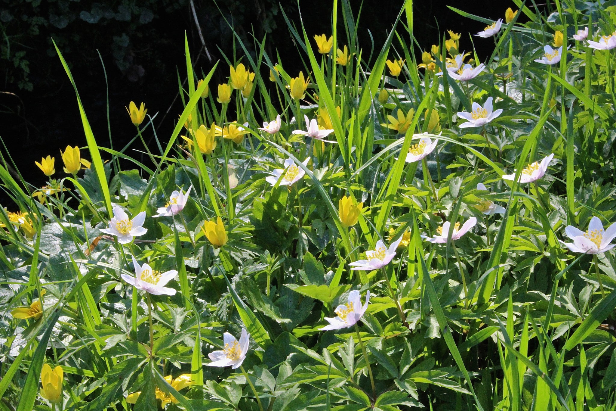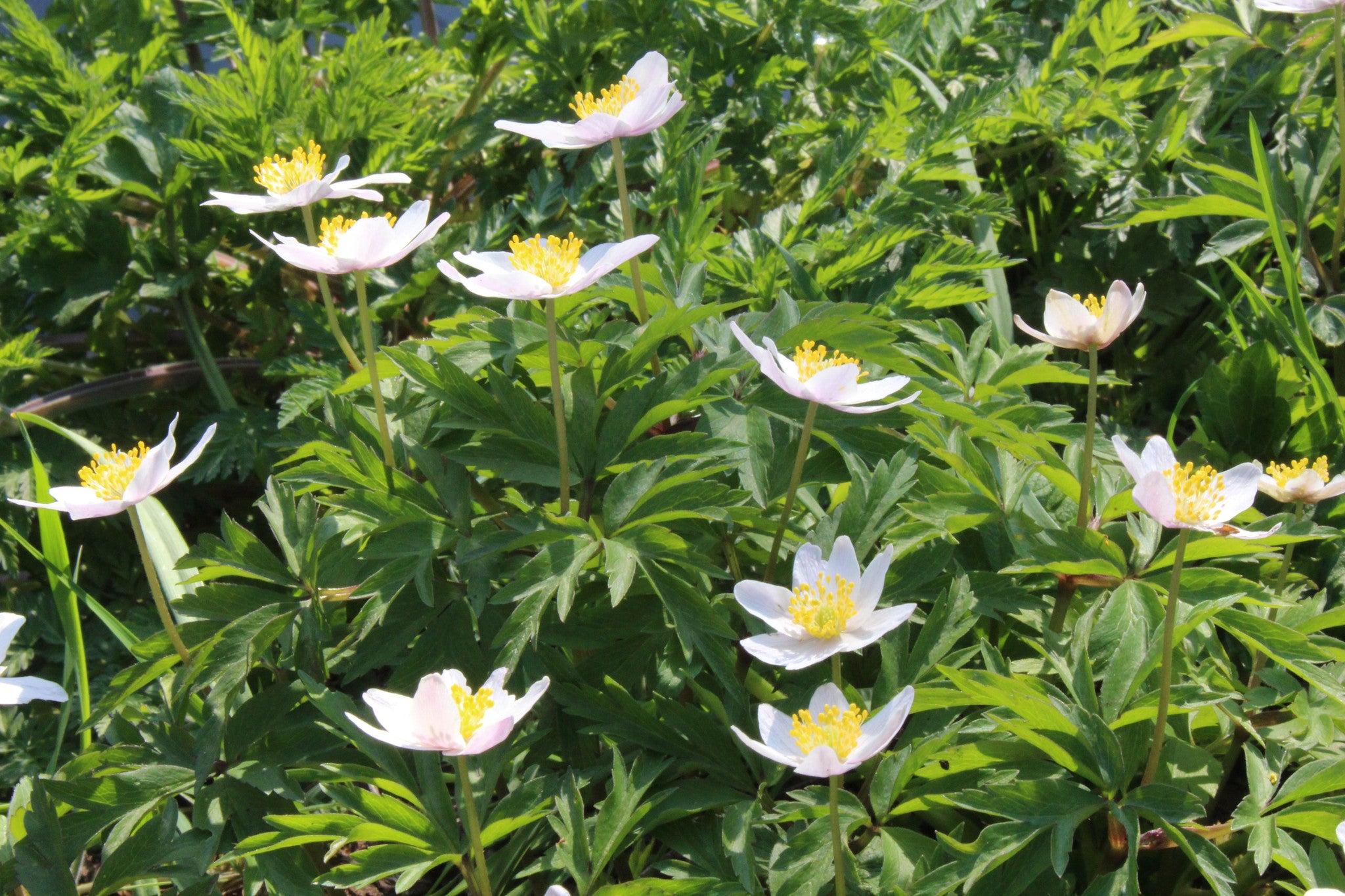 Anemone nemorosa is an early-spring flowering plant, native to Europe. Common names include wood anemone, windflower, thimbleweed, and smell fox, an allusion to the musky smell of the leaves. The specific epithet nemorosa is derived from the Latin nemus meaning 'forest' - a reference to the woodland habitat in which these flowers grow. White flowers, often softly shaded with lavender pink on their reverse, they look great with Ficaria verna (the yellow plant in the photo).