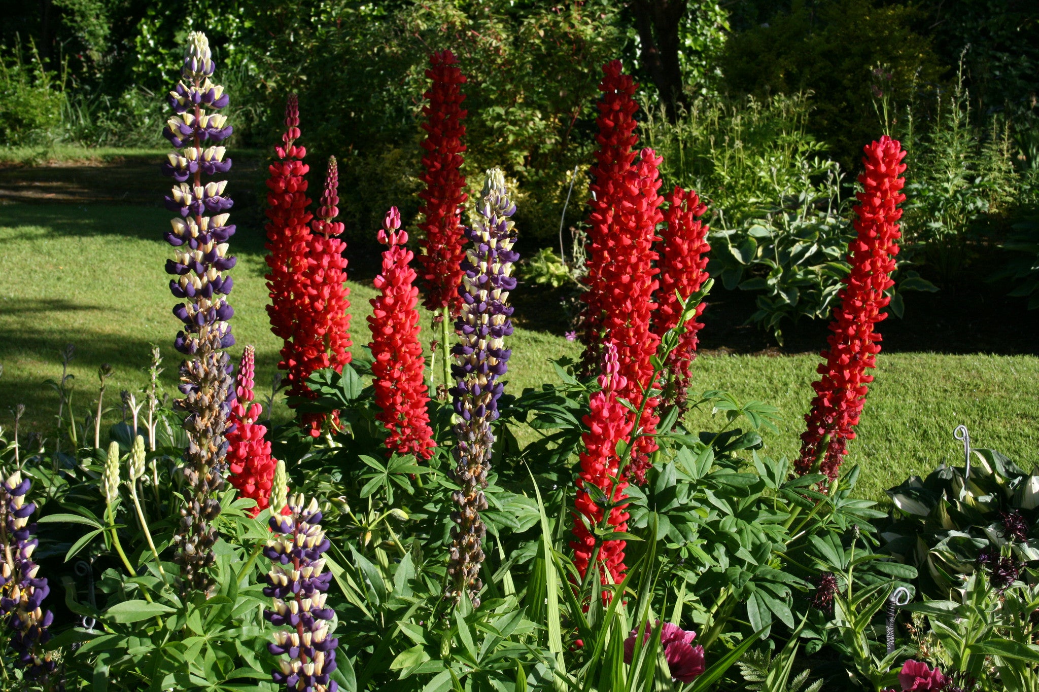 Lupinus 'Beefeater' has strong spikes of vibrant, almost pure-red flowers with yellow flecked standards. Just like the Yeomen Warders at the Tower of London - also known as Beefeaters.