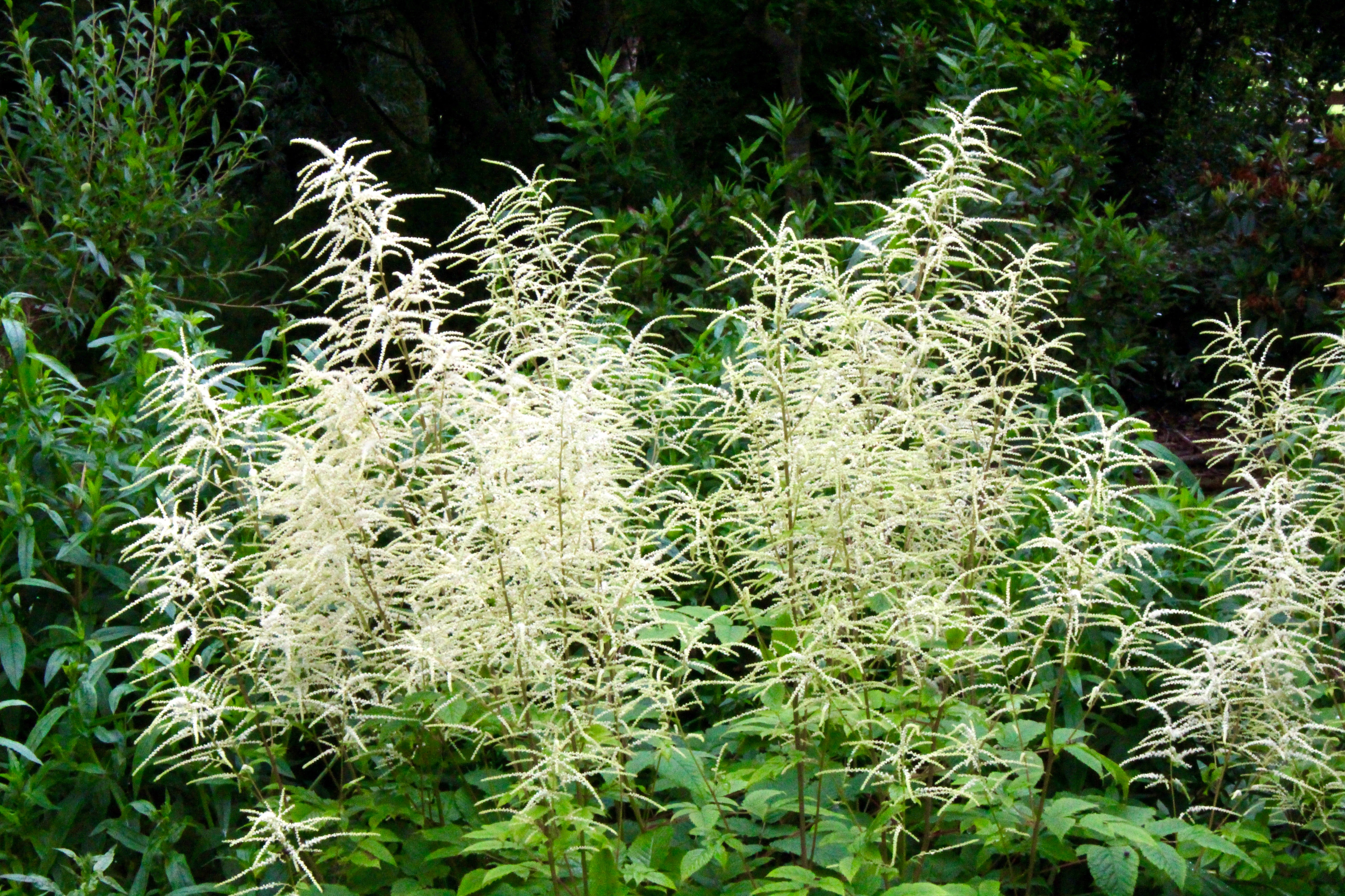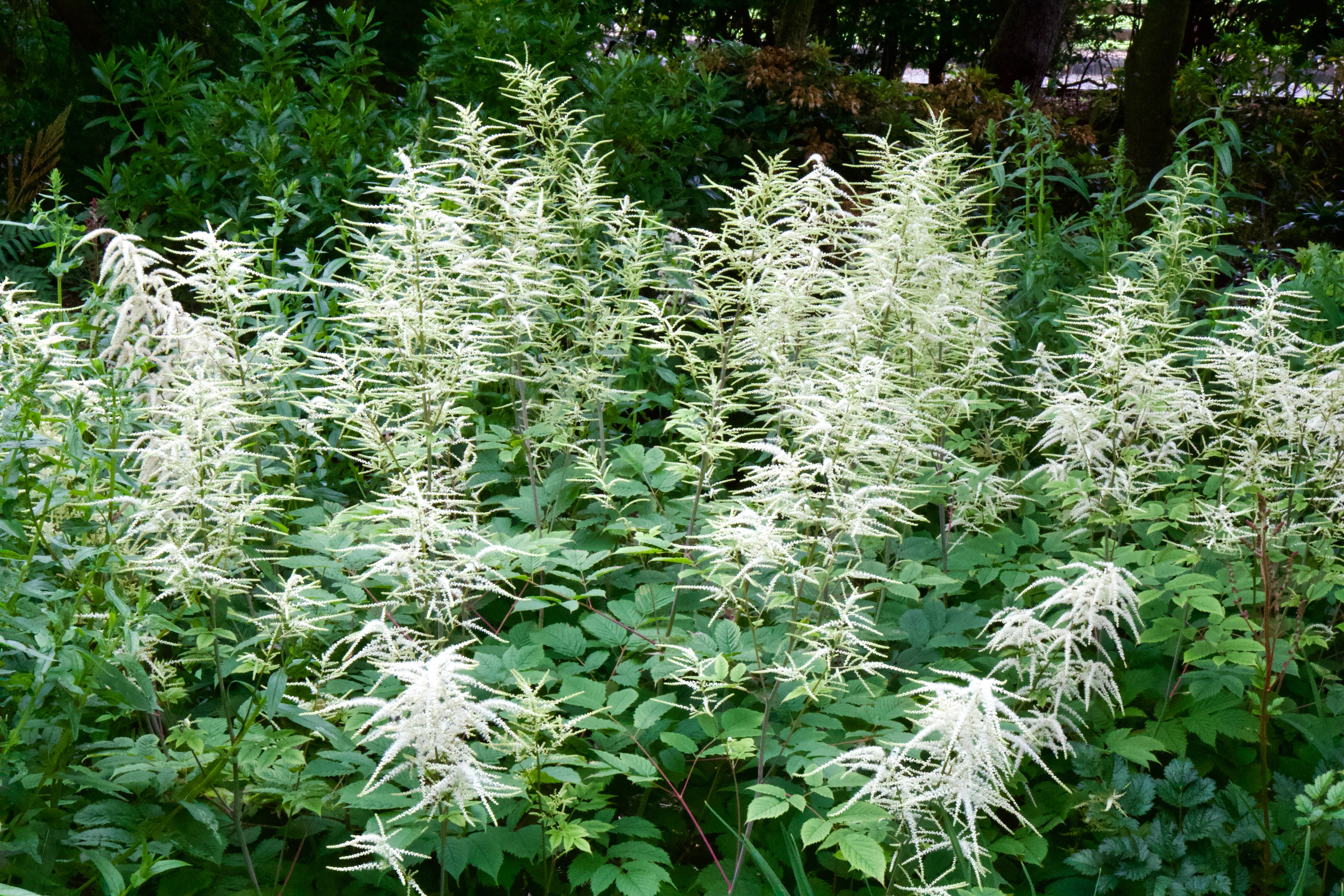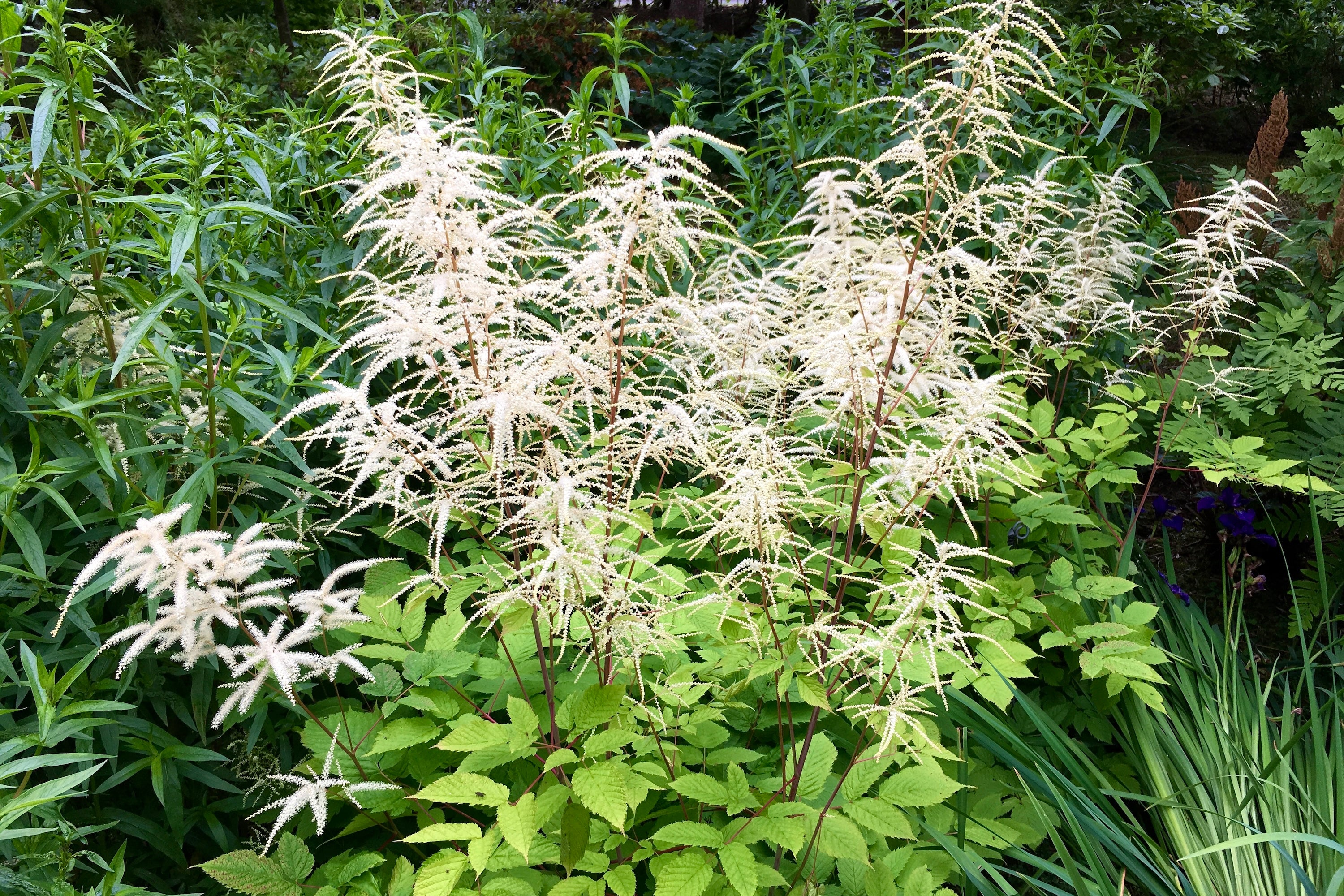 Aruncus blooms in spring and summer with large clusters of tiny creamy white flowers in a feather-like inflorescence produced above veined and toothed leaflets. The flowers also make long-lasting cut flowers and dry well for arrangements. Many people compare Aruncus to the more colourful Astilbe as the two share a similar appearance and habitat. I find Aruncus plants have a finer, wispy texture that moves more in the breeze, giving a wilder feel.