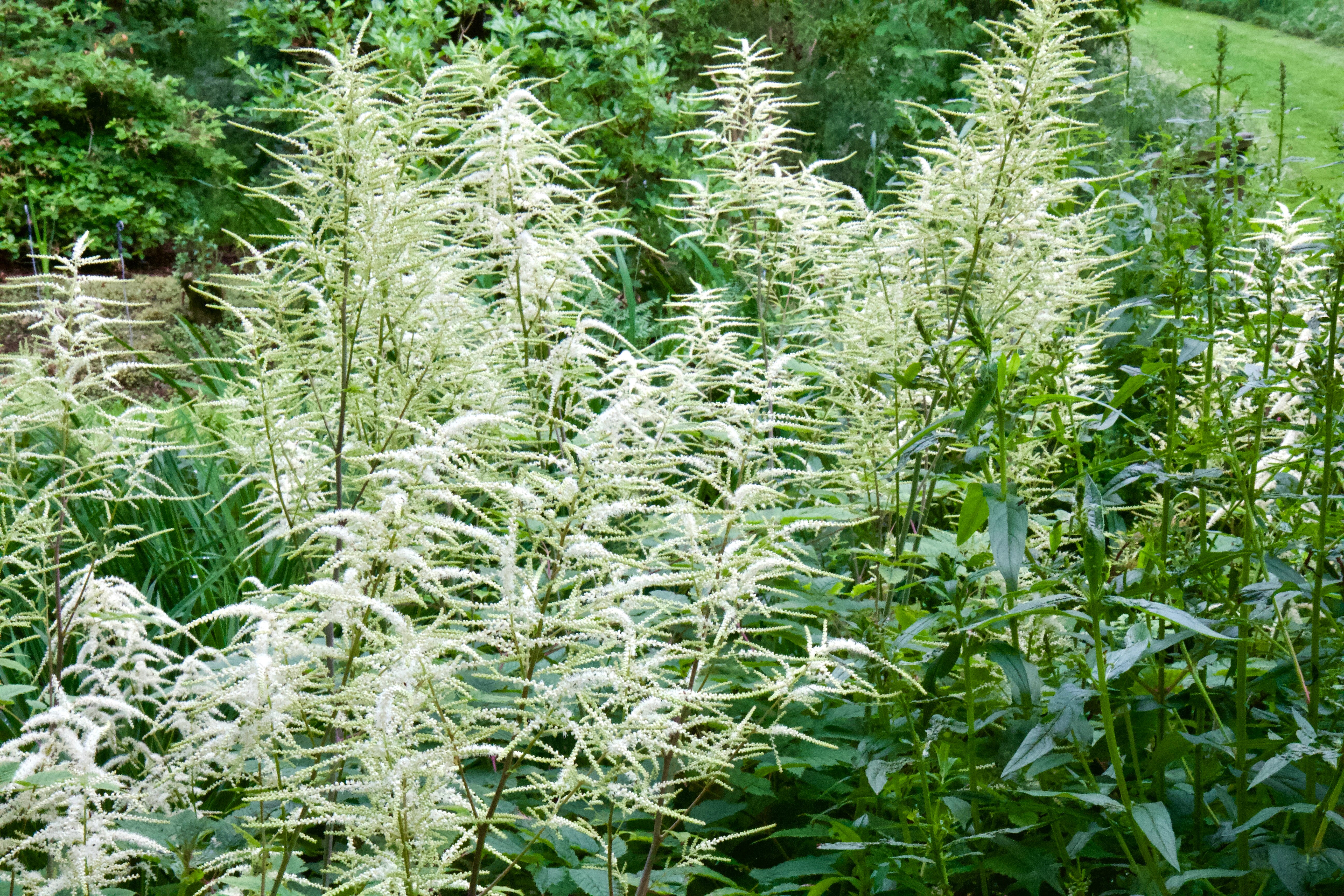 Aruncus always has people asking about it when the see it in the garden, I am surprised it is not more popular. I think of it as a giant, whispy, Astilbe. Lovely dried seed heads over winter. A tall, erect, bushy, clump-forming plant which features pinnately compound, dark green foliage and showy, plume-like spikes of tiny, cream coloured flowers which rise well above the foliage in early to mid summer, creating a bold effect.