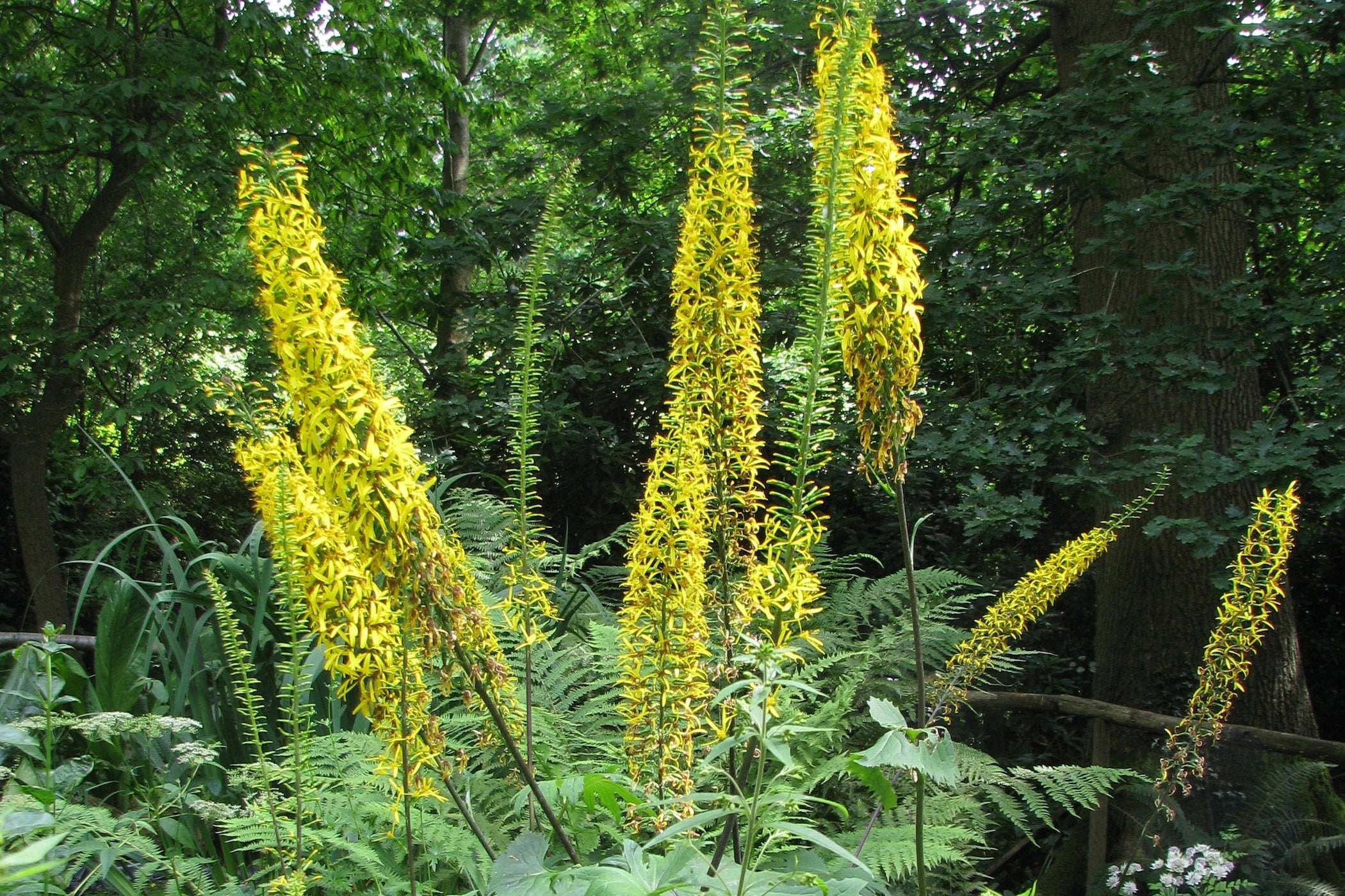 Ligularia 'Zepter' is a perennial with Spikes of closely packed orange-yellow flowers from dark stems. Zepter is the German for scepter, possibly because it has the Royal Horticultural Society Award of Garden Merit.