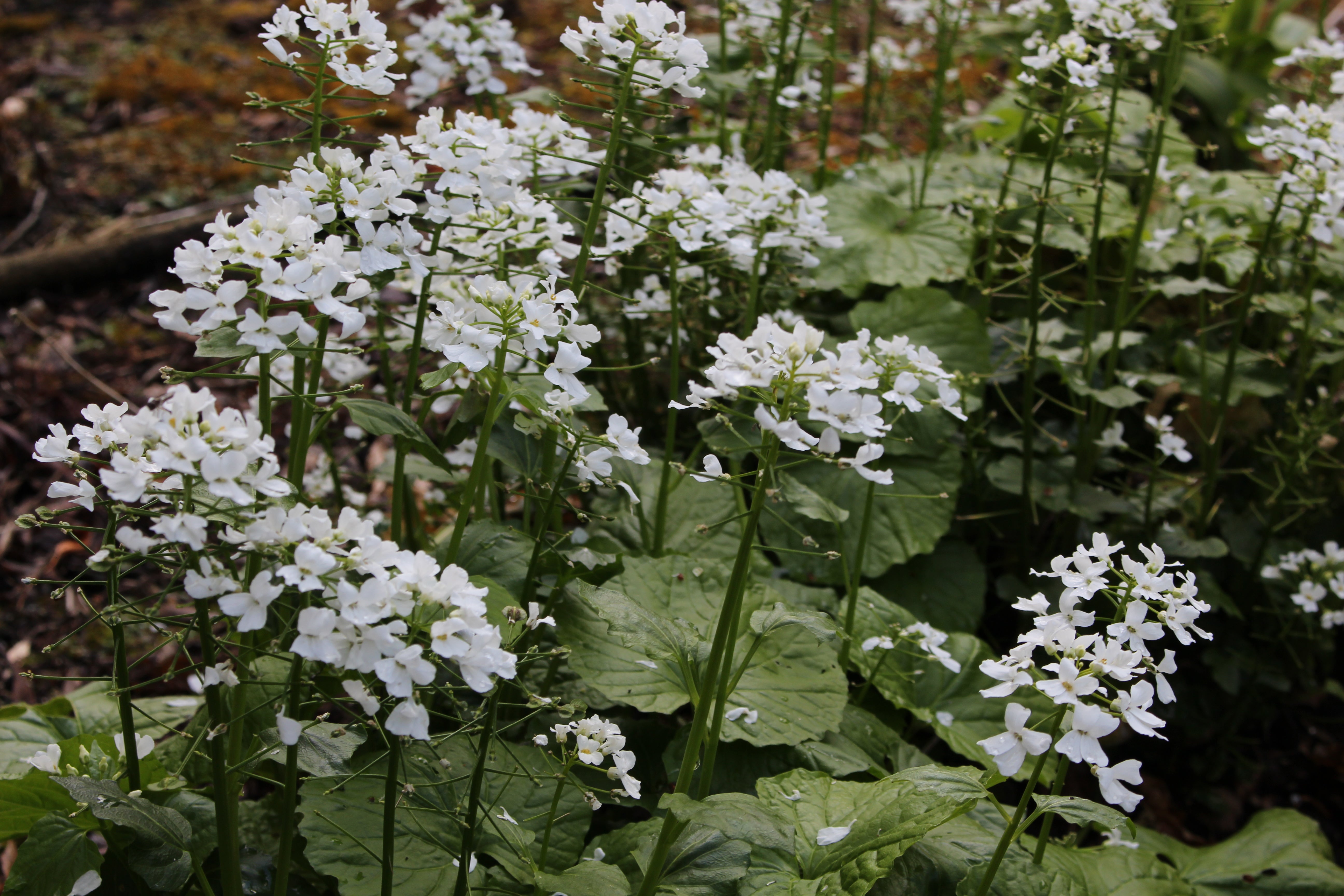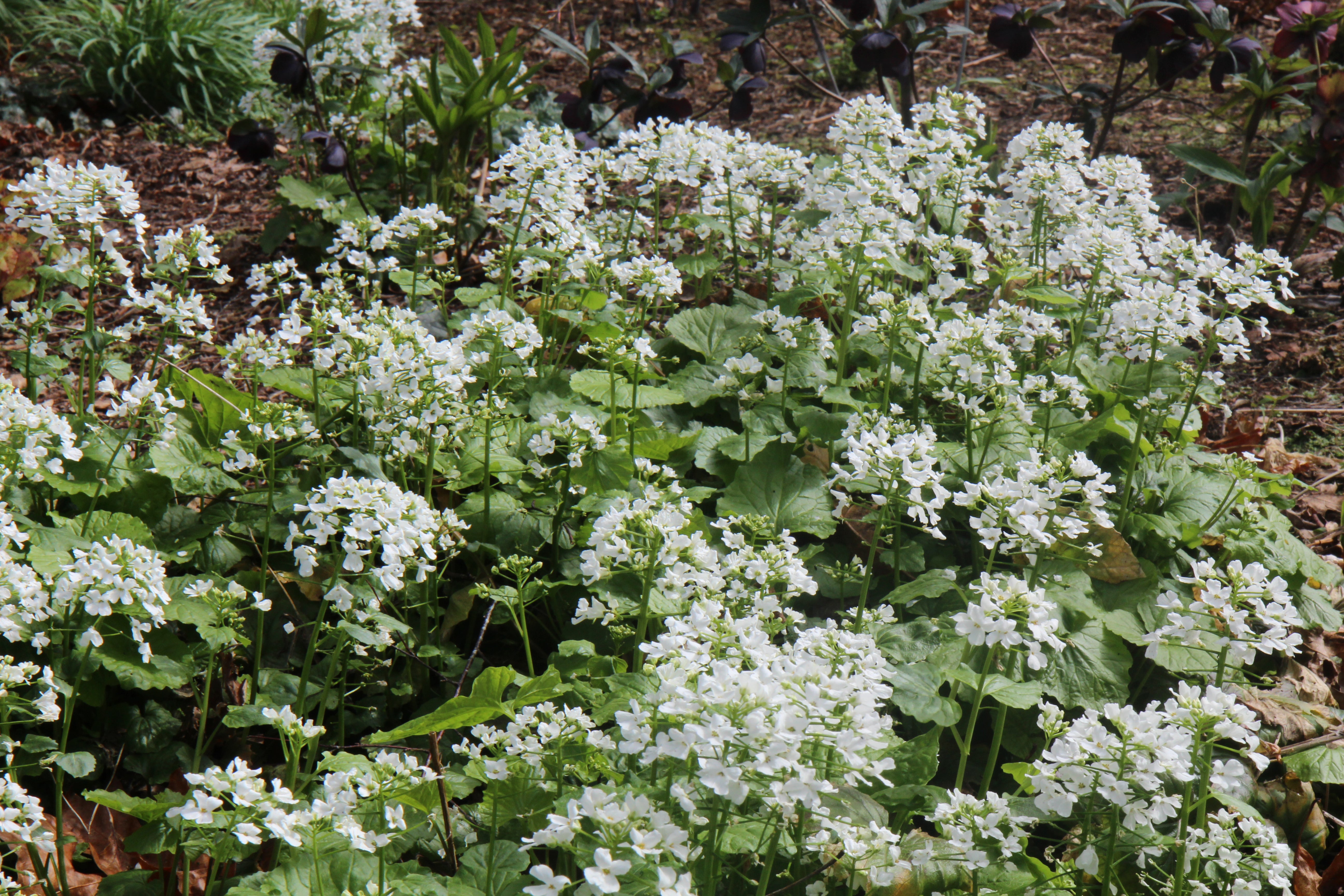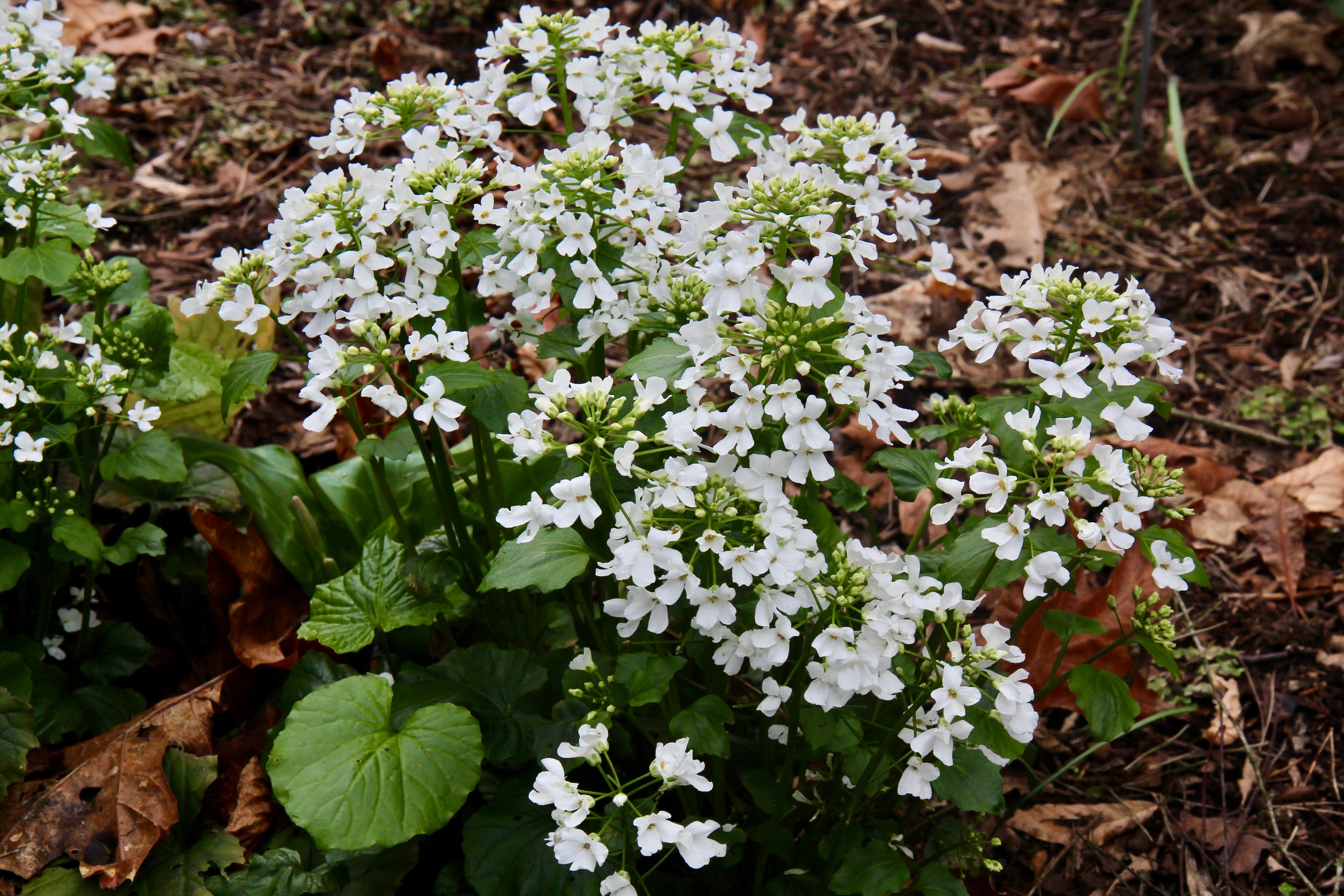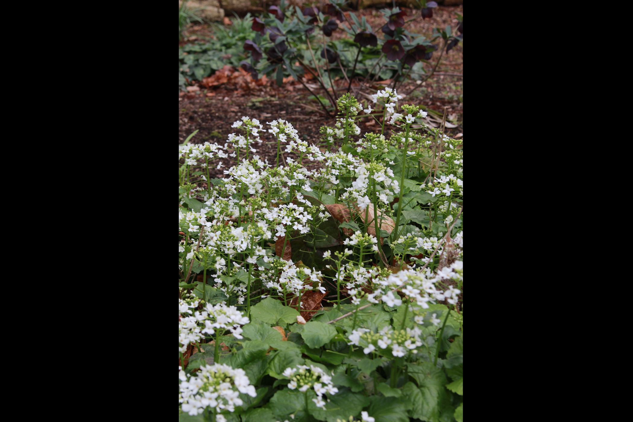 Pachyphragma macrophyllum provides rounded, semi-evergreen, scalloped green basal leaves, lying in rosettes and smaller stem leaves, with flat clusters of small white flowers appearing in early spring. Small green fruits in the shape of upside-down hearts soon follow.