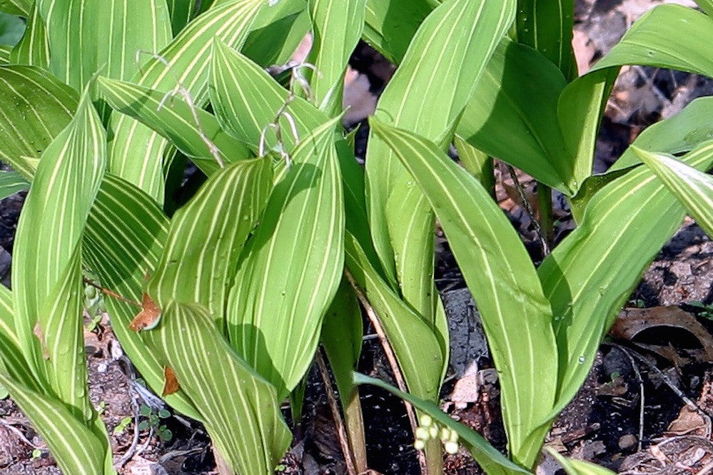 Convallaria majalis 'Albostriata' is a variegated cultivar with vertically striped with creamy-gold bands and creamy white flowers. Most variegated cultivars revert within a year or so: this one is the most persistent. It also doesn't spread as fast as the many other Convallaria.