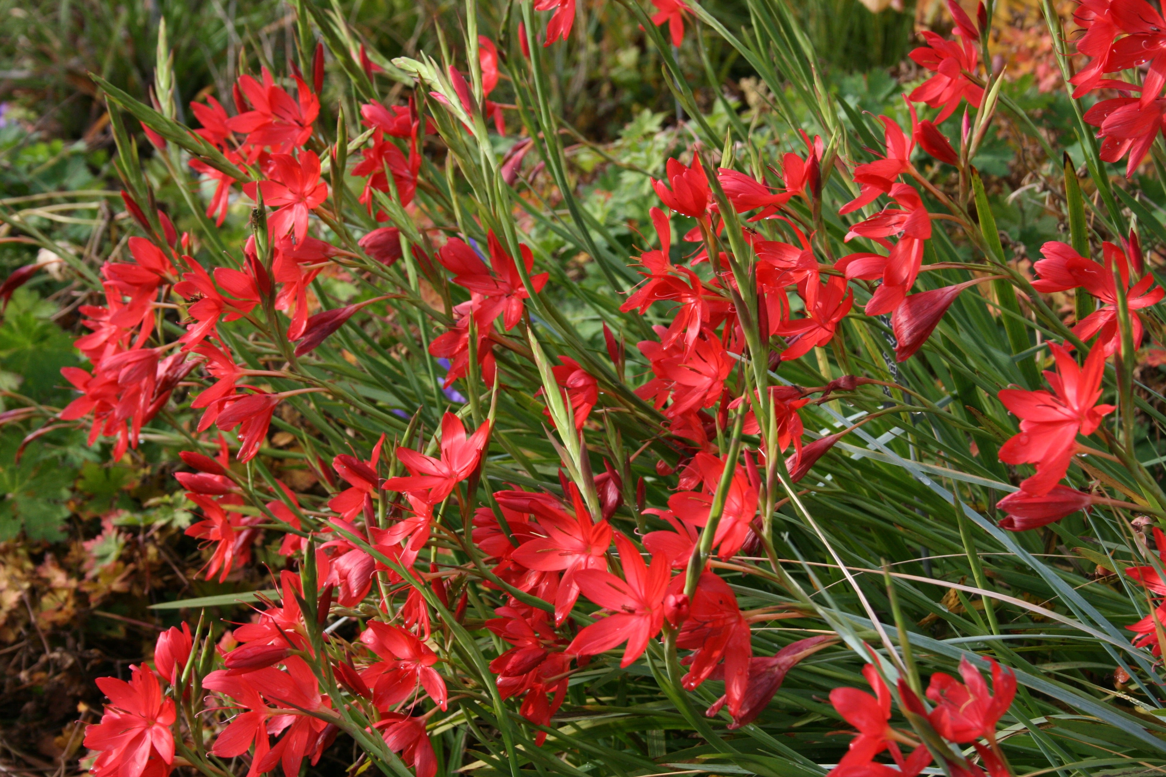 The synonym Schizostylis is widely used in horticulture for the single rhizomatous species S. coccinea, widely cultivated as a garden flower, and with numerous cultivars. Hardy plants with us, they like moisture but they'll grow almost anywhere that isn't a dark room or a swimming pool. They make excellent cut flowers. These semi-evergreen bulbs promise to ease the sadness that comes at summer’s end by offering a burst of fresh autumn colour - I've seen these in flower on Christmas day. My father loves the pink cutivars in autumn - I hate pink in autumn and will only tolerate red or yellow flowers! Make up your own mind!