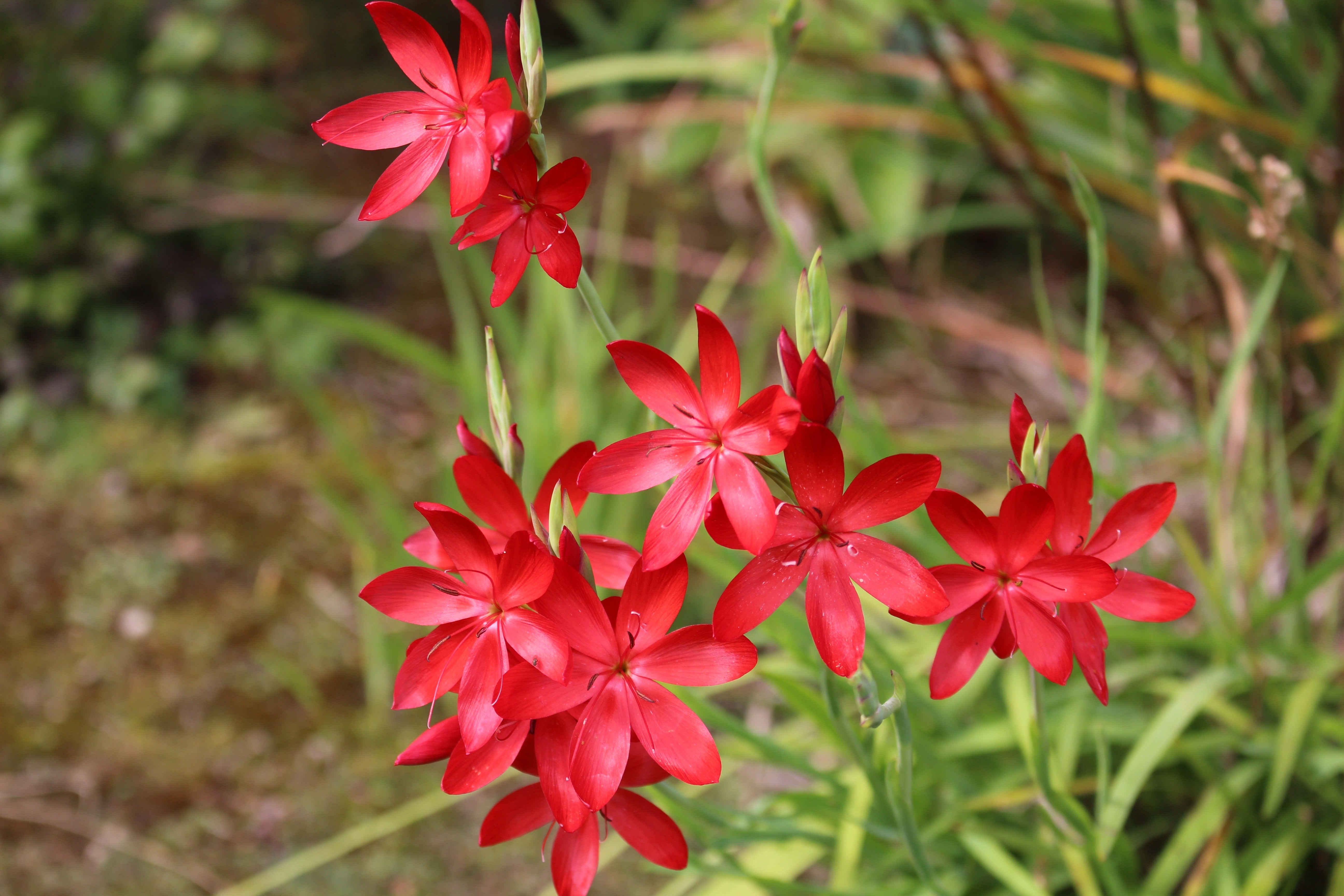 Hesperantha coccinea 'Cindy Towe' is the earliest flowering Hesperantha we have. Much the same as 'Major', nice habit, nice red flowers, and early. Flowers until the first frost.