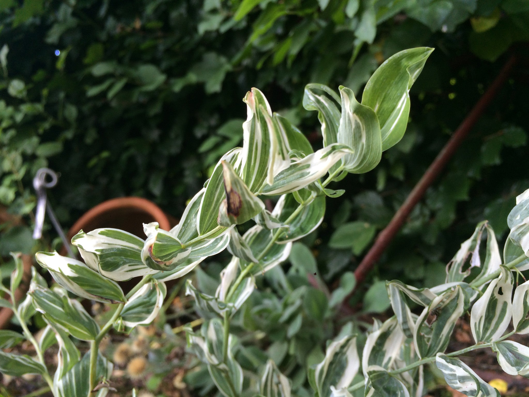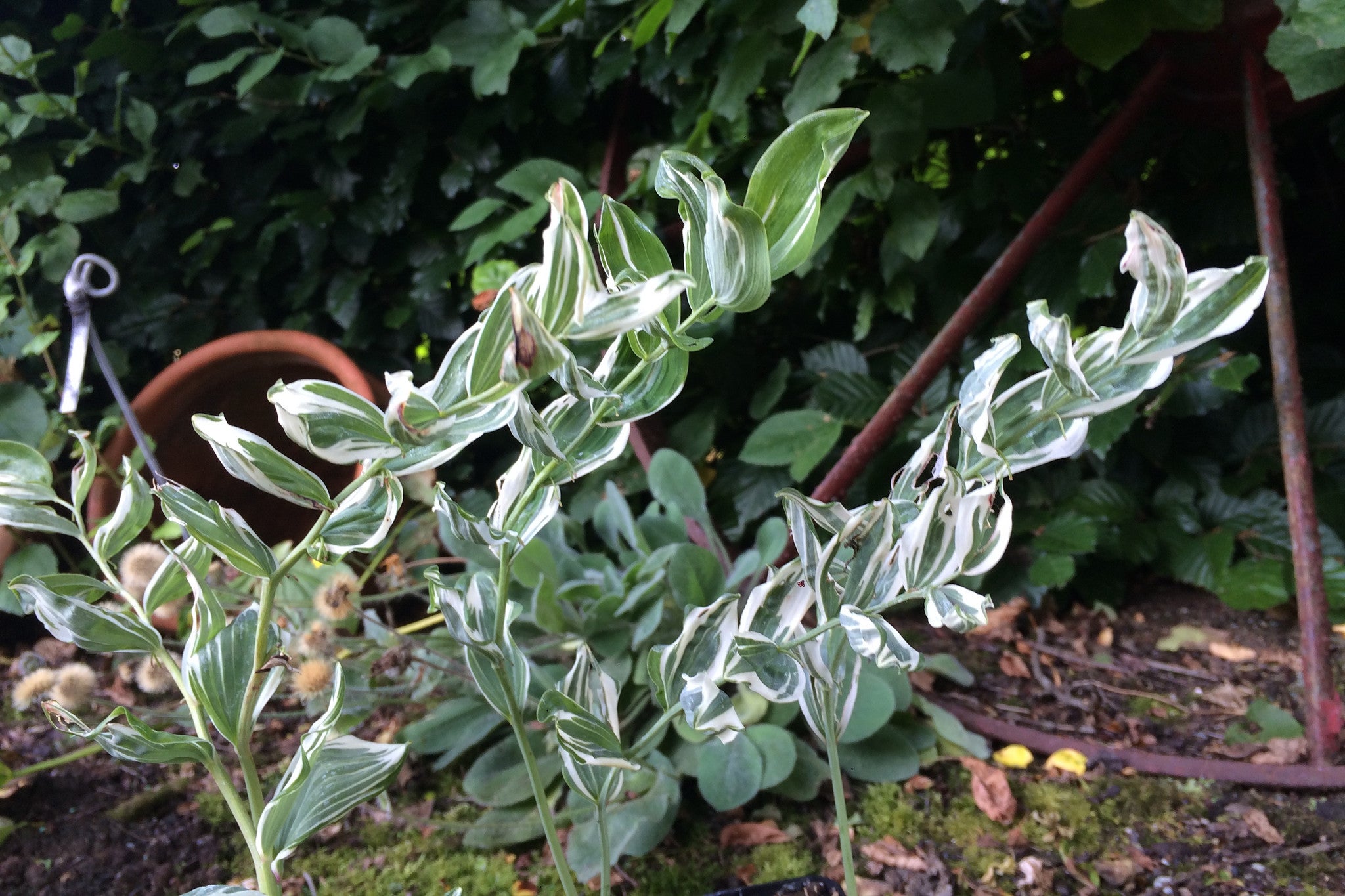 Polygonatum x hybridum 'Striatum' is some times known as Polygonatum x hybridum 'Grace Barker'. This unique Solomon's seal is a dwarf variegated selection from the hybrid Polygonatum multiflorum x Polygonatum odoratum. The stems are adorned with small, dark blue-green, crinkled foliage, surrounded by an irregular white border. The unique Polygonatum 'Grace Barker' is easy to grow and quite vigorous in colder climates but slows dramatically as it approaches regions with milder winters.