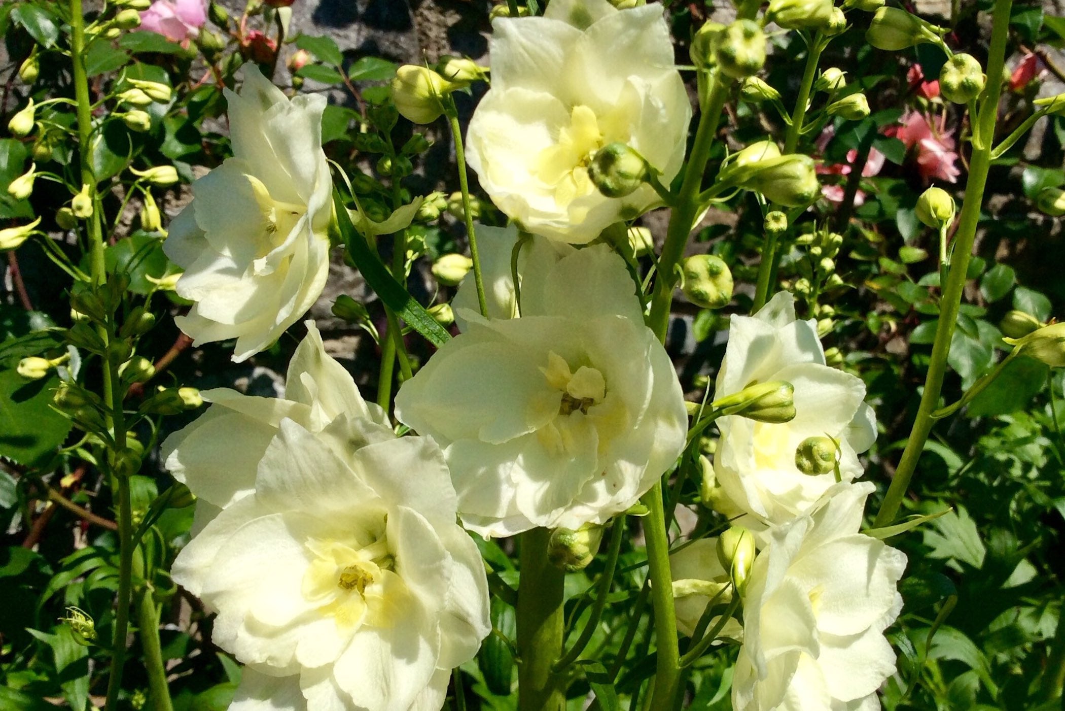 Delphinium 'Sungleam' is an erect herbaceous perennial with divided foliage and racemes of semi-double, creamy-white flowers, strongly tinged yellow and with yellow eyes. It has the Royal Horticultural Society Award of Garden Merit.