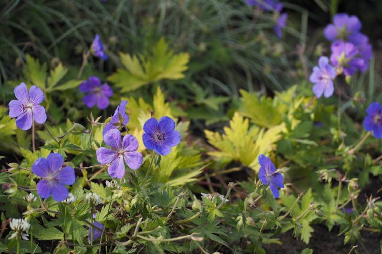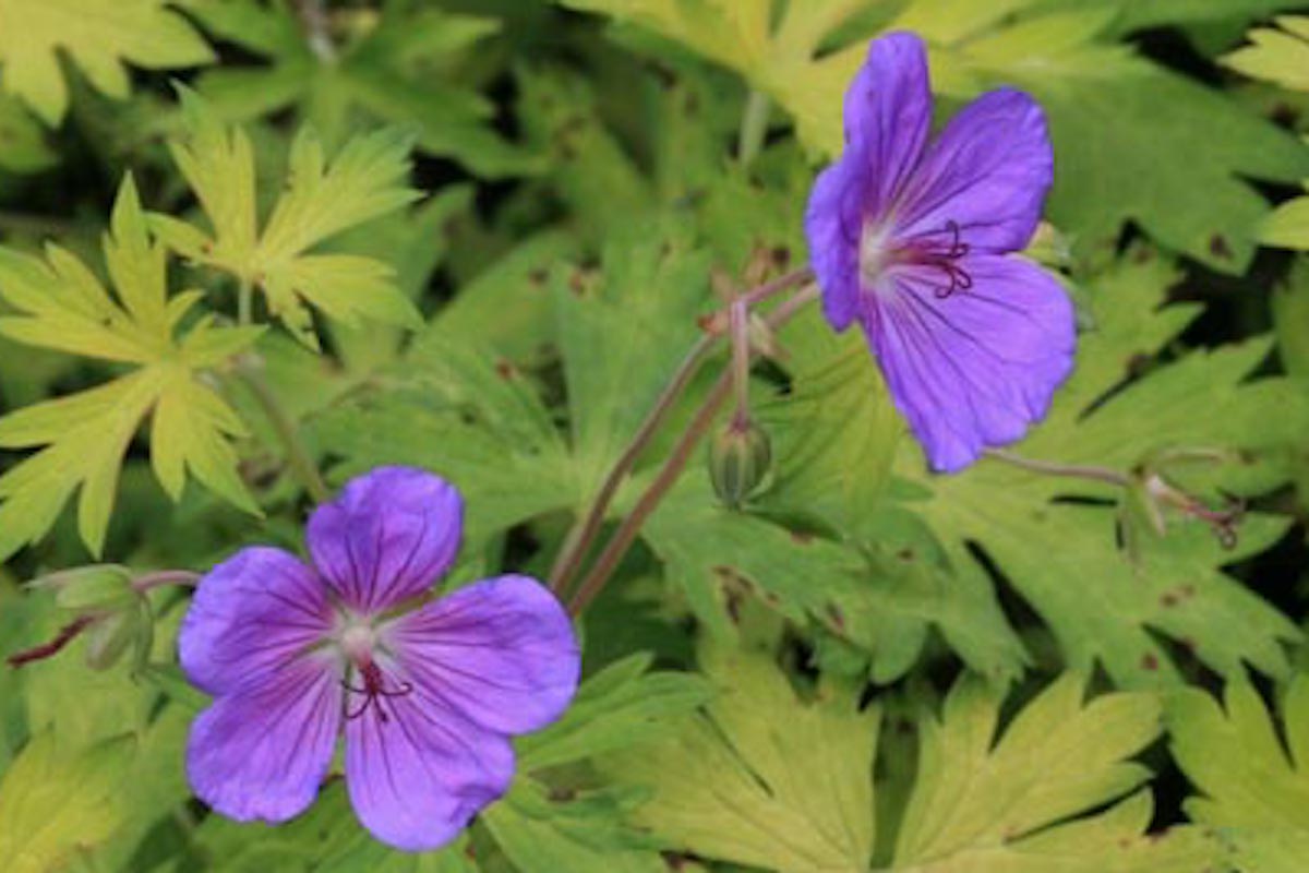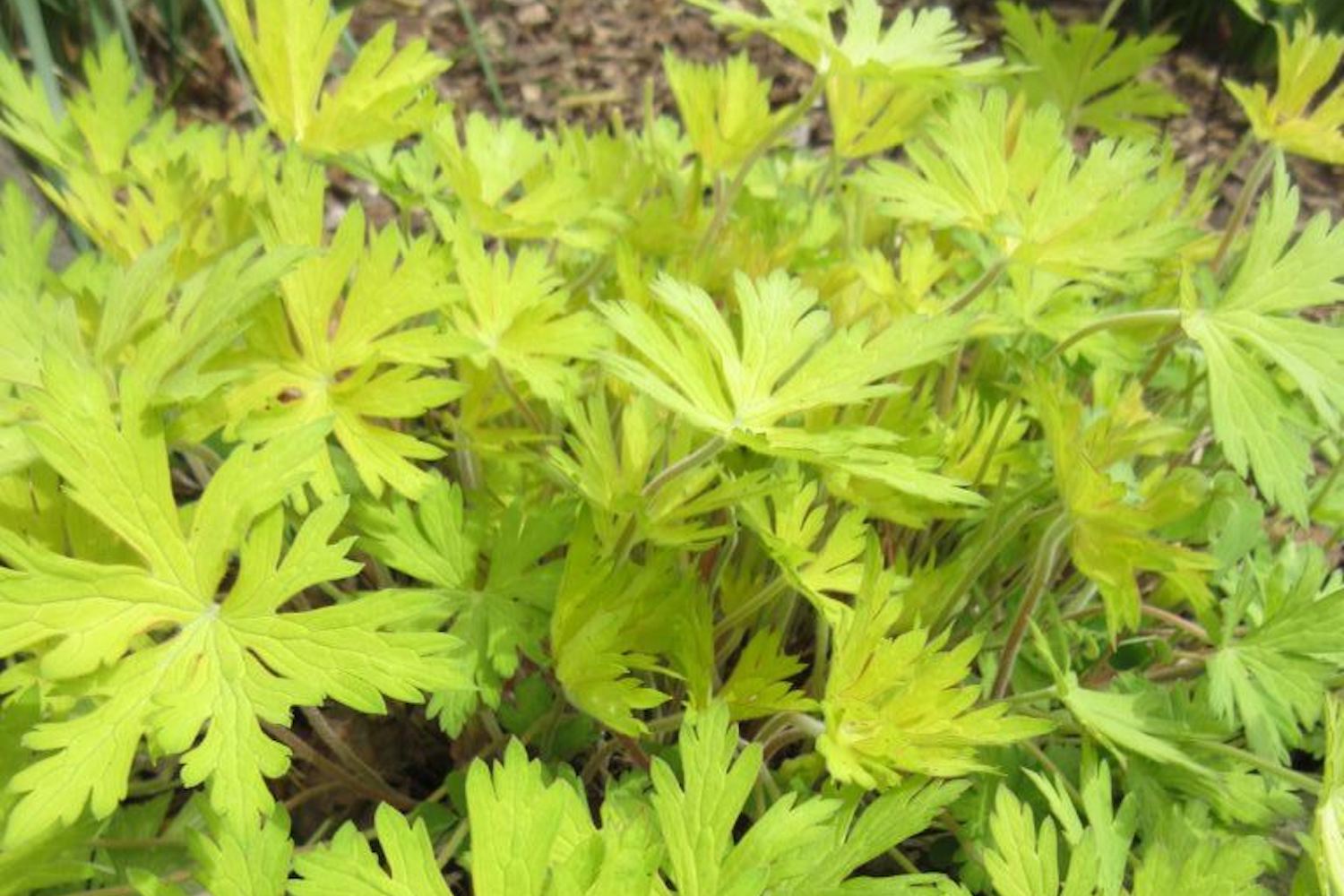 Geranium BLUE SUNRISE 'Blogold' has a robust constitution and a low-growing, sprawling habit - great for the front of a border. It was discovered in August of 1994 by Hans Kramer of the Netherlands. The deeply cut leaves are amber yellow in spring, becoming greener in summer, and taking on red tints when nights chill in autumn. The stems can almost turn orange. Flowers are a violet-blue. Received the Royal Horticultural Society Award of Garden Merit in 2005. reminds me a bit of Ann Folkard in spring but lower and blue ....