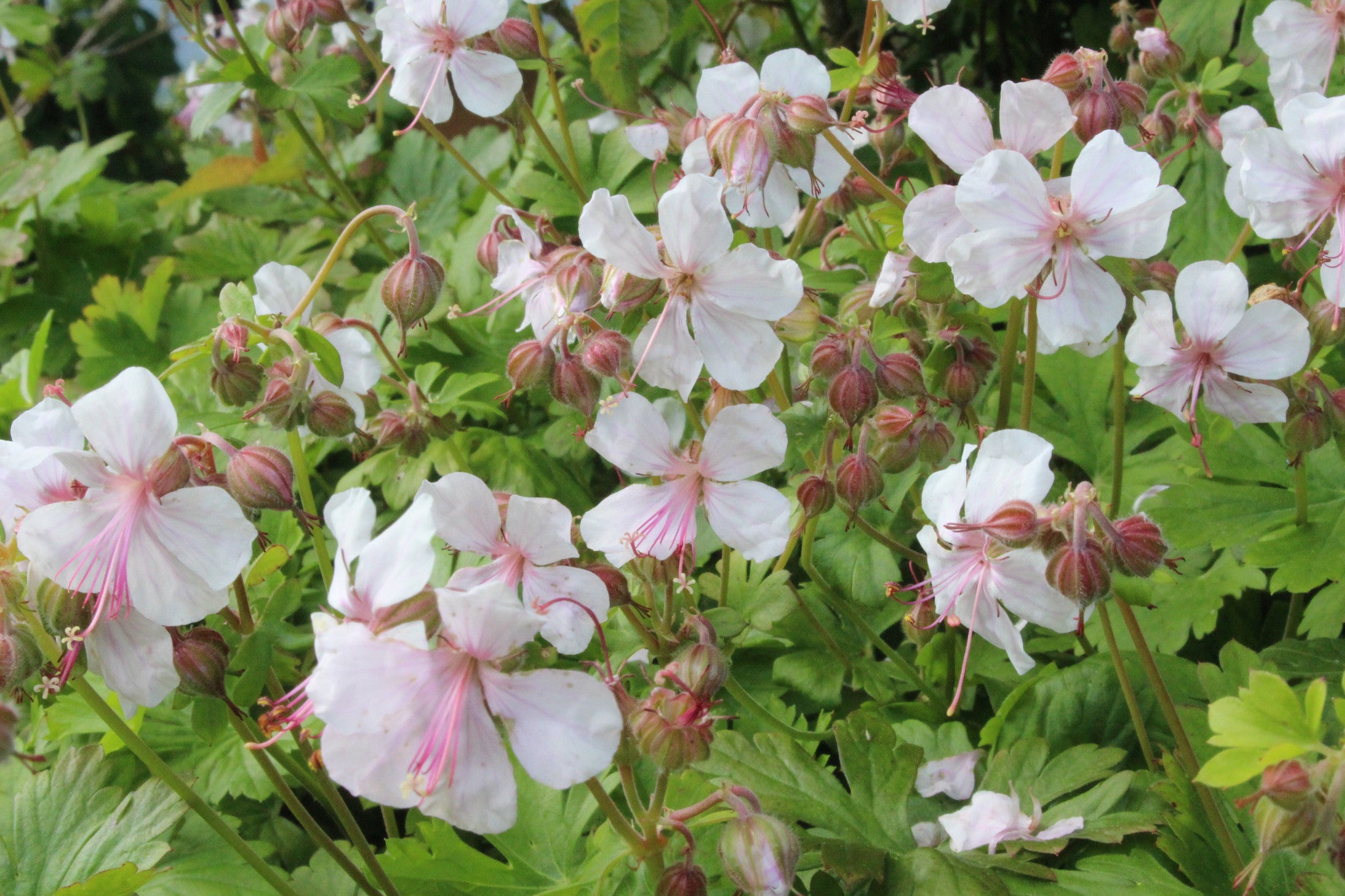 Geranium is a genus of 422 species of flowering plants found throughout the temperate regions of the world and the mountains of the tropics, They come in a variety of shapes and sizes and the five-petaled-flowers can be white, pink, purple or blue, often with distinctive veining. The genus name is derived from the Greek géranos meaning ‘crane’. The common name is‘cranesbill’. Why the crane reference? Well, some species in the Geranium genus have a distinctive mechanism for seed dispersal. This consists of a column which springs open when ripe and casts the seeds some distance. The shape of the unsprung column looks like the bill of a crane- therefore cranesbill!
