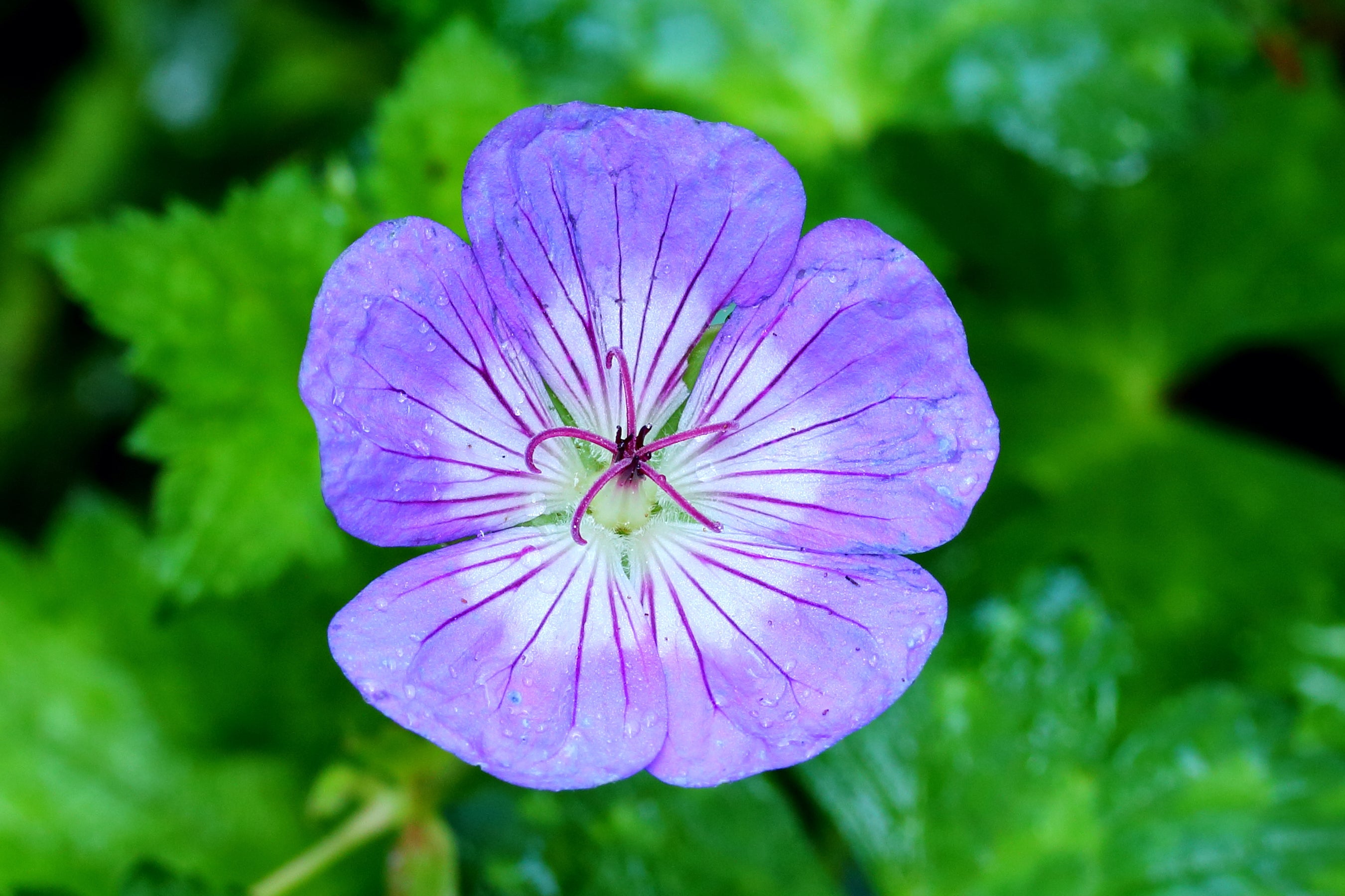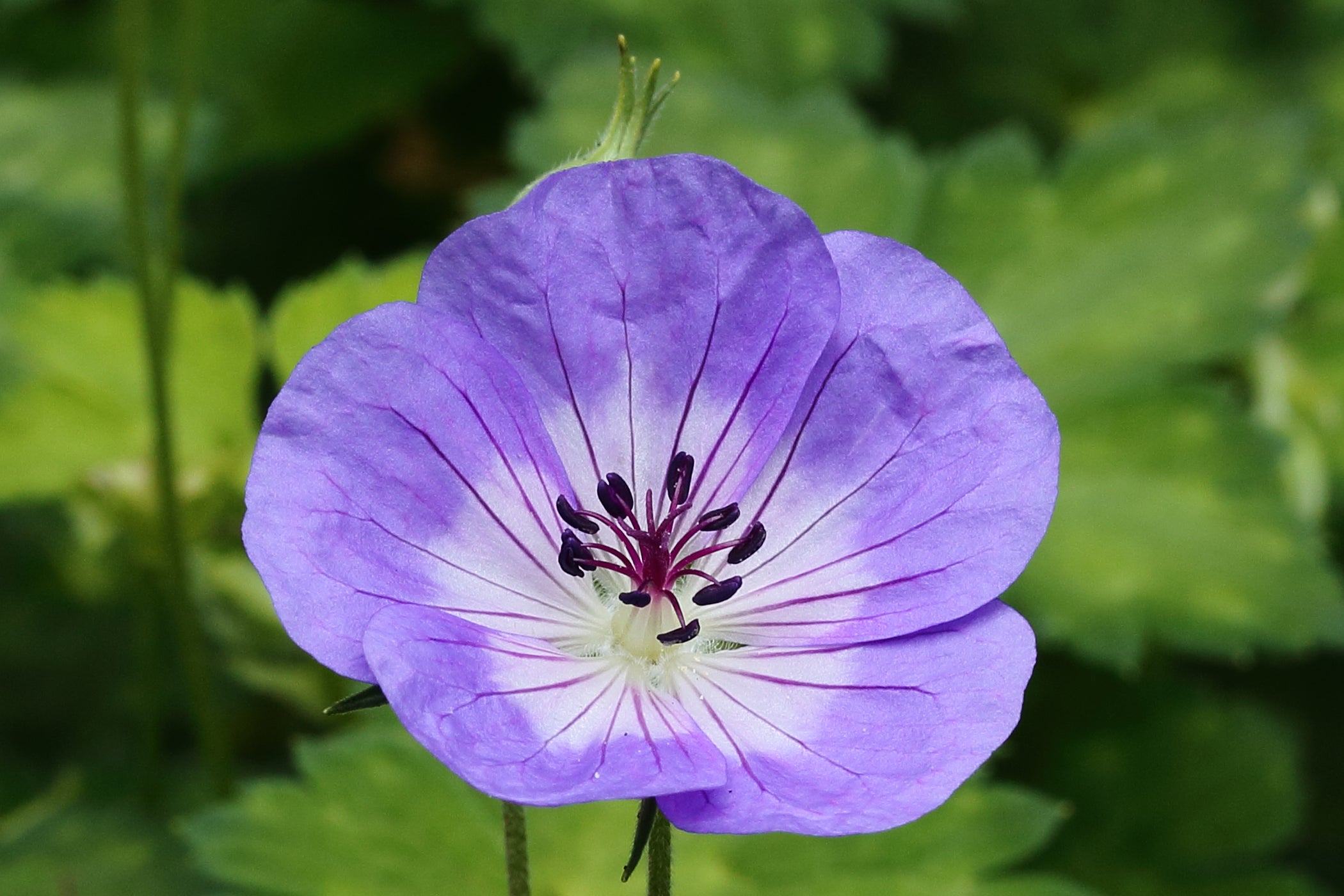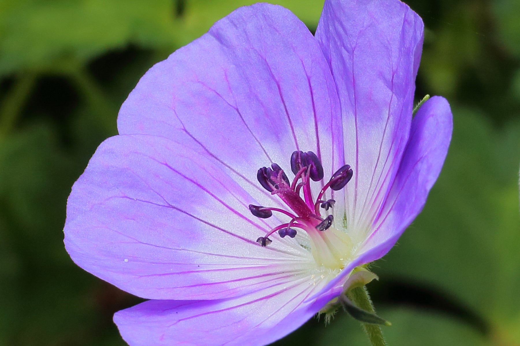 Geranium is a genus of 422 species of flowering plants found throughout the temperate regions of the world and the mountains of the tropics, They come in a variety of shapes and sizes and the five-petaled-flowers can be white, pink, purple or blue, often with distinctive veining. The genus name is derived from the Greek géranos meaning ‘crane’. The common name is‘cranesbill’. Why the crane reference? Well, some species in the Geranium genus have a distinctive mechanism for seed dispersal. This consists of a column which springs open when ripe and casts the seeds some distance. The shape of the unsprung column looks like the bill of a crane- therefore cranesbill!