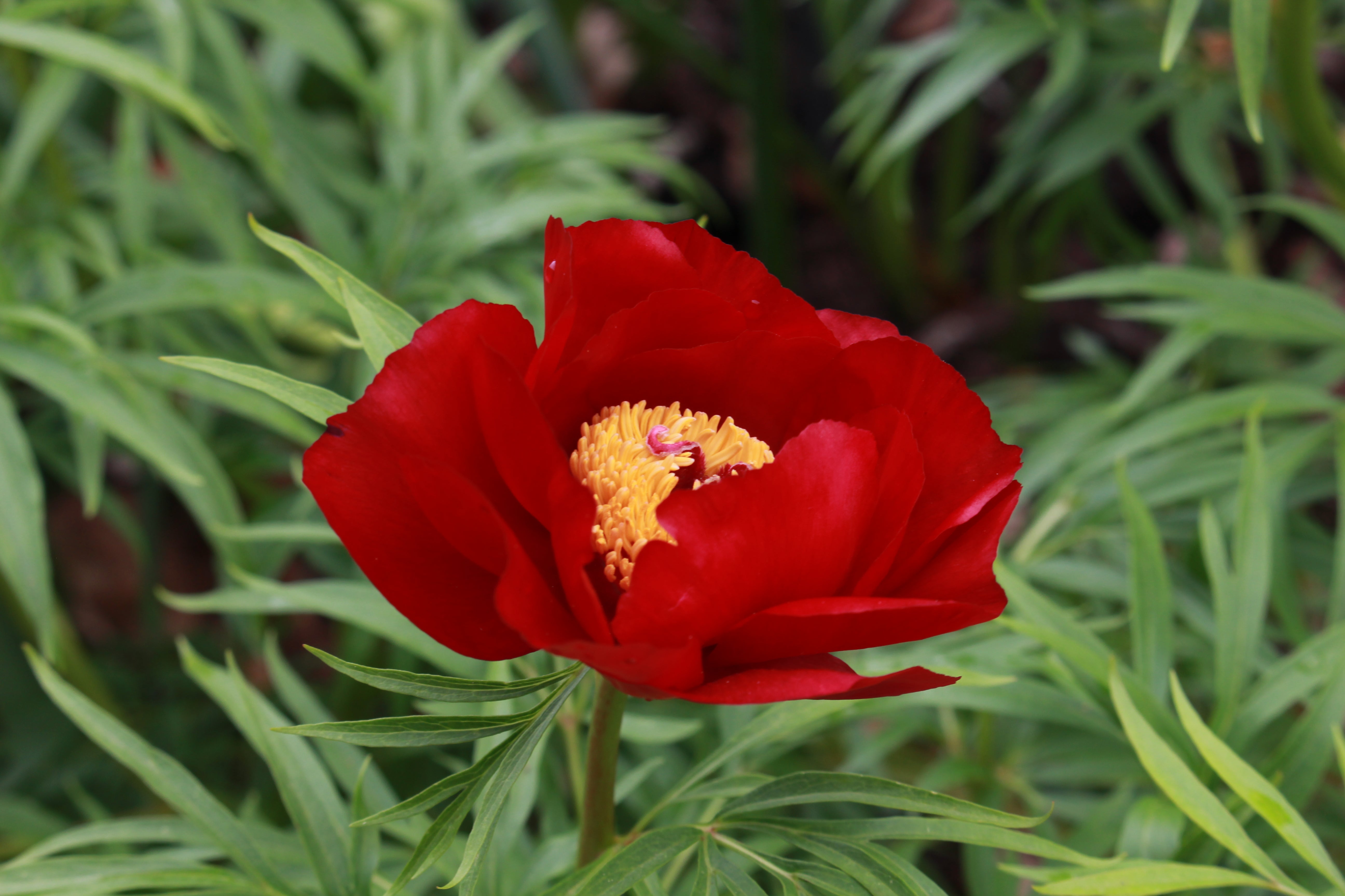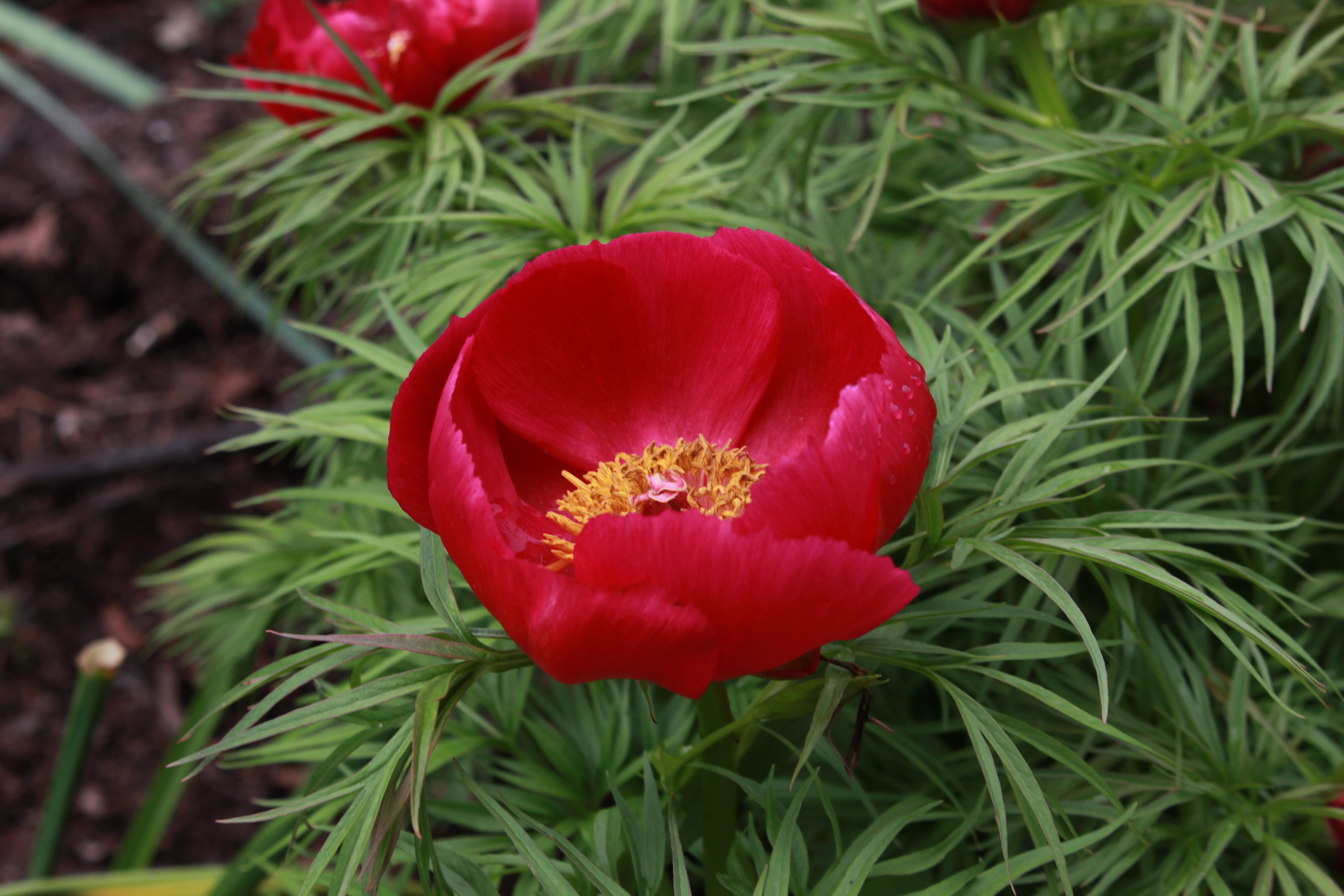 Paeonia x smouthii hybrid between Paeonia lactiflora and Paeonia tenuiflora, resembling a larger version of the latter with narrowly cut foliage and brilliantly red flowers. Very slow but easier to grow than tenuiflora.