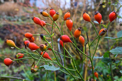 The aggregate fruit of the rose is a berry-like structure called a rose hip. Rose hips are occasionally made into jam, jelly, marmalade, and soup or are brewed for tea, primarily for their high vitamin C content. They are also pressed and filtered to make rose hip syrup. Many Rosa cultivars do not produce hips, as the flowers are so tightly petalled that they do not provide access for pollination. Poor little bees. Rose perfumes are made from rose oil, which is a mixture of volatile essential oils obtained by steam distilling the crushed petals of roses. About two thousand flowers are required to produce one gram of oil! Rose petals also have a variety of culinary uses; from teas to salads and scones to ice creams