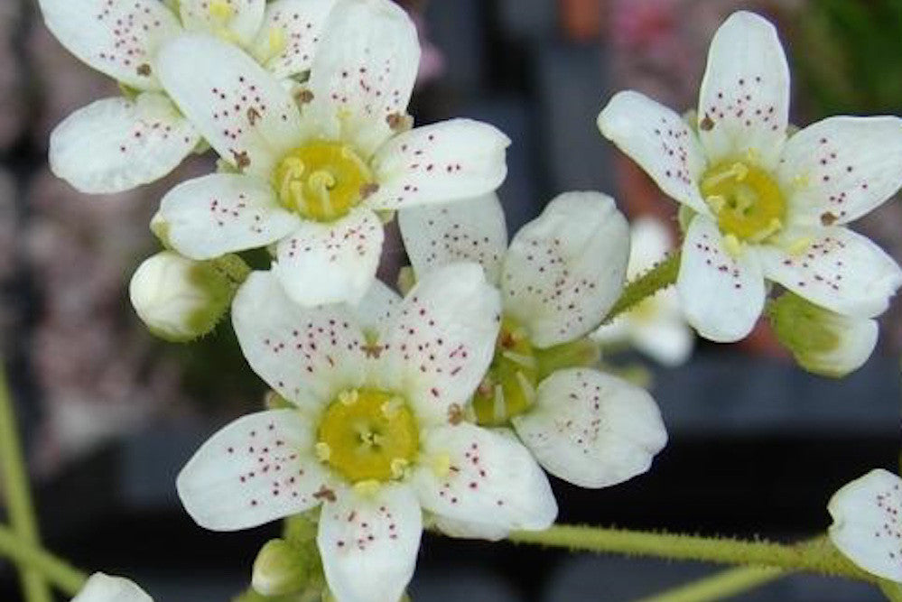 The genus Saxifrage is a very diverse genus with a wide range of semiperennial to perennial plants, covering some 480 species in total. Saxifrages can be found from the greater part of the temperate and sub-arctic zones of the northern hemispheres with some "exotic" outposts in Ethiopia, Mexico and the Arctic region. Several subalpine species from dryish spots in mountainous regions have succulent, usually nicely glaucous leaves in dense rosettes and make very dense, floriferous clusters with time. Most Saxifrage are best grown in small crevices filled with well drained soil in full sun to part shade in the rock garden. e have most of ours stuck in walls and nook and crannys. However we also have a few at the front of the border! A few of the bigger one can tolerate a lot of moisture.