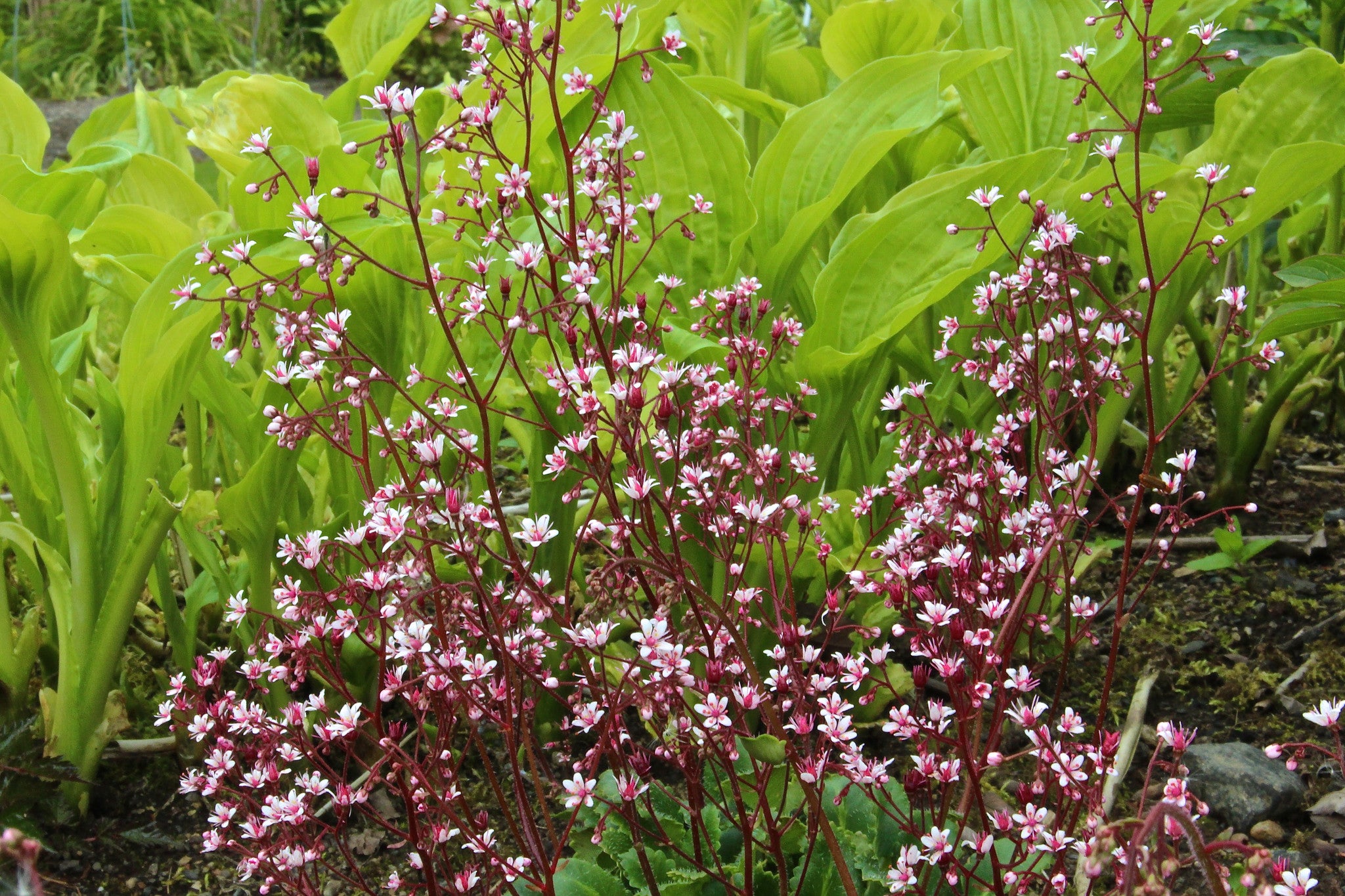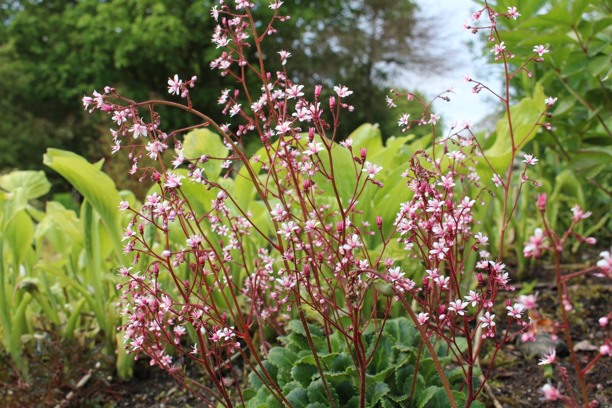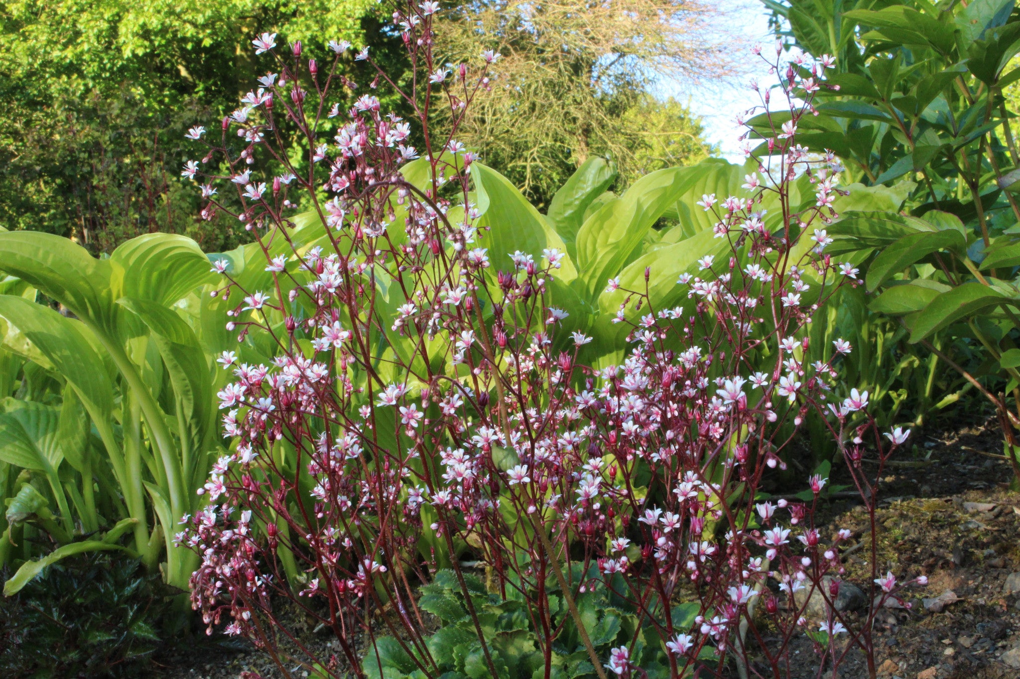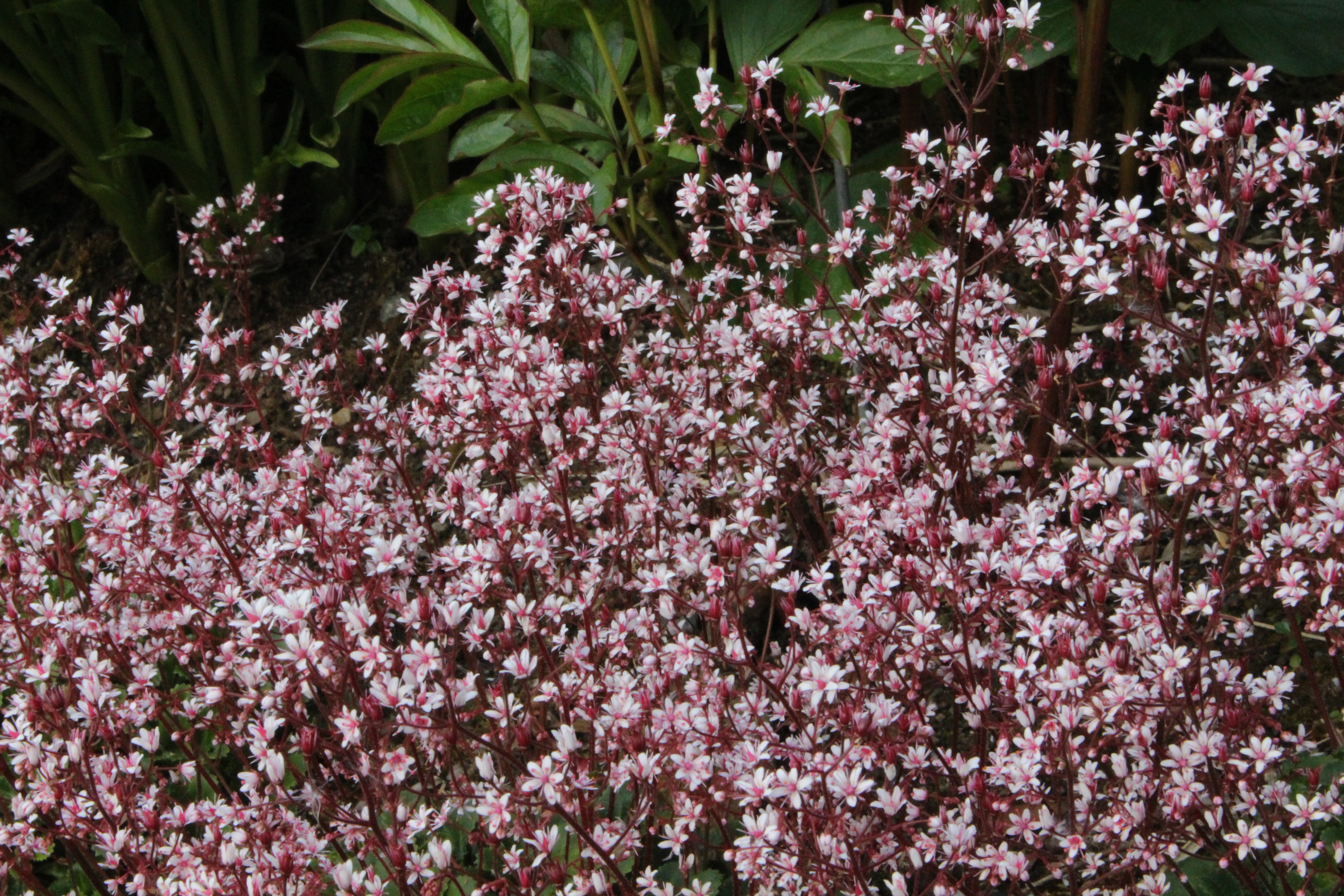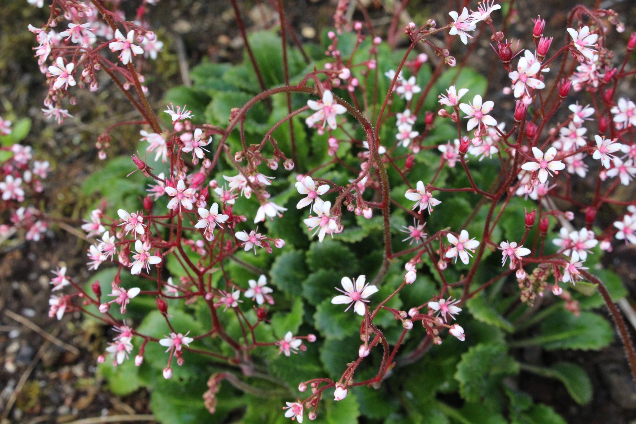 Saxifraga x geum Dixter form (11) is a form of the x geum types of saxifrage. Until recently treated as a species, this is now known to be a hybrid between S. umbrosa and S. hirsuta. The form and toothing of the leaves are very variable and in the past these variations in form have been named and distributed as 'Crenata', 'Dentata', 'Gracilis' etc. This practice now seems to have ceased. S. x geum occurs mainly in the Pyrenees but has become naturalised in many European countries including Britain. This particular form makes carpeting rosettes of small evergreen leaves. Bronze-tinted branching stems carry airy sprays of white-petalled flowers appearing pink because of their crimson centres. I presume this form has something to do with Great Dixter, but I haven't seen any evidence for this apart from the name.