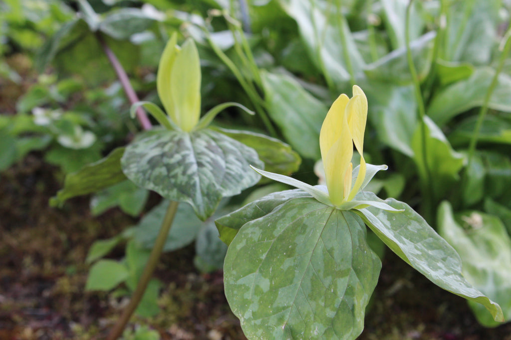 Trillium luteum, is also know as yellow wake robin. The broad foliage of this species is marbled with light green and yellow, echoing the colours of the showy flower. A luscious light lemon scent adds to its appeal.
