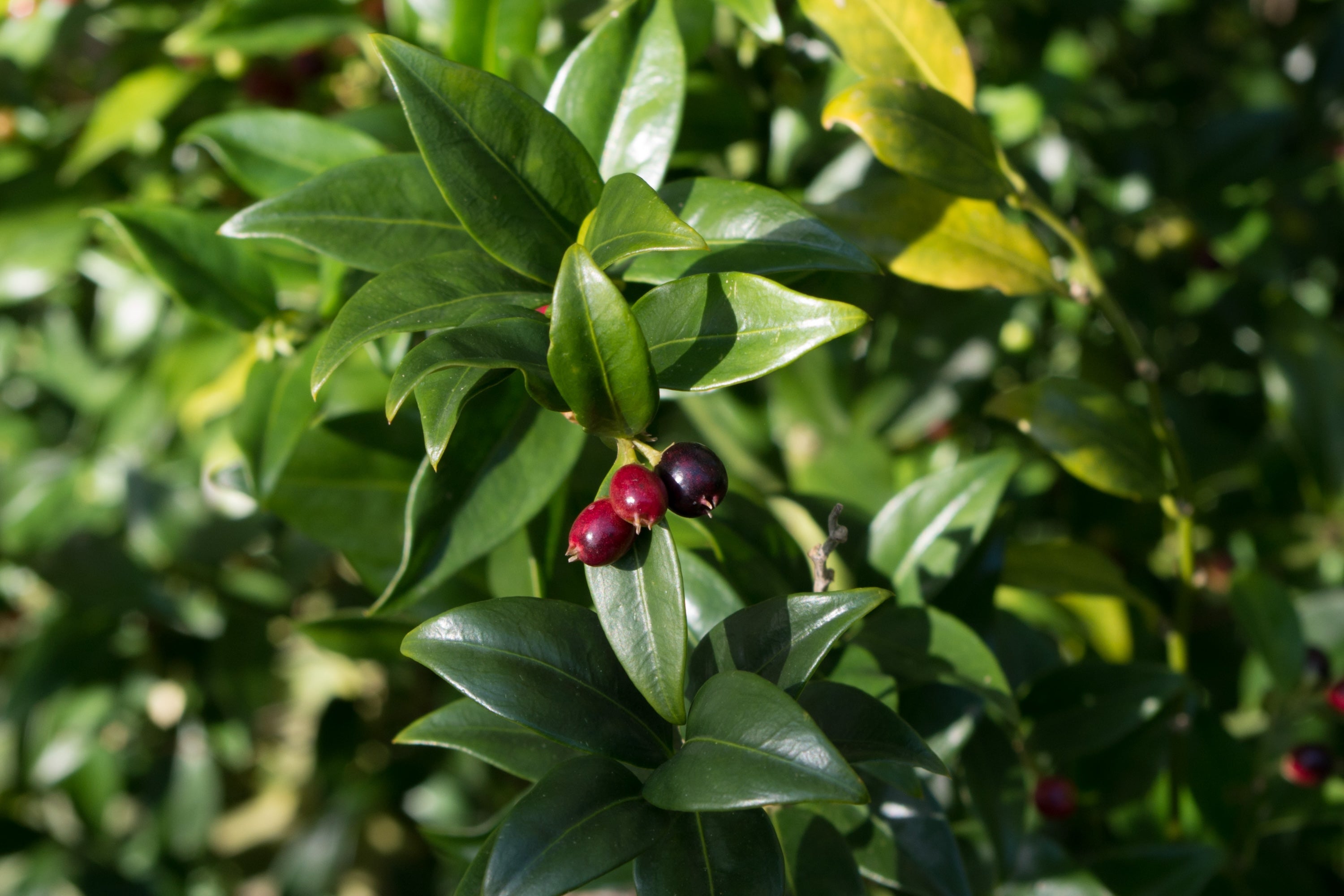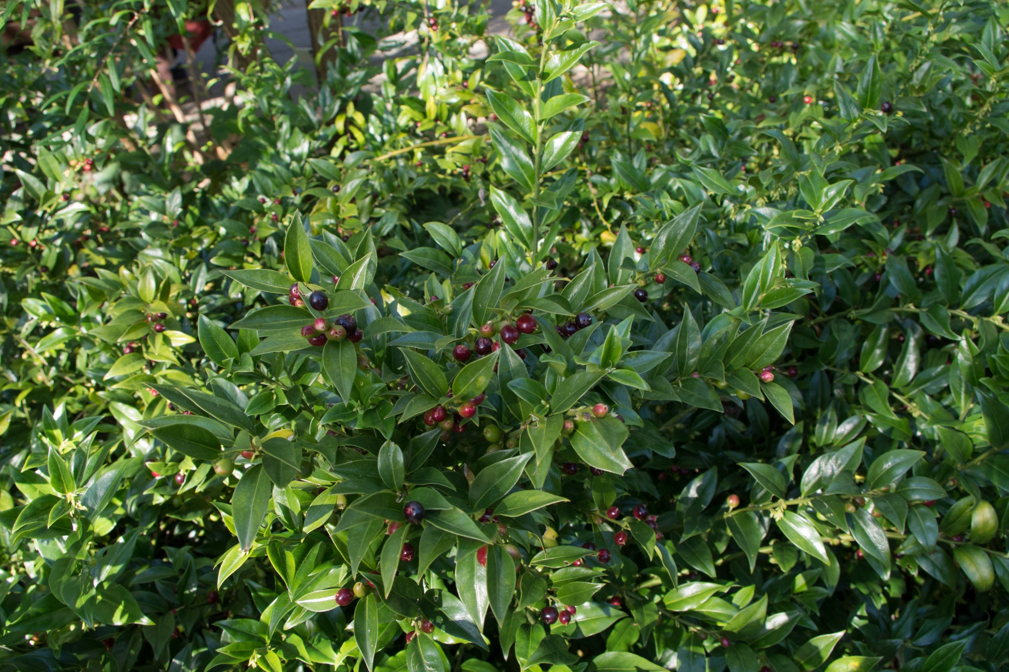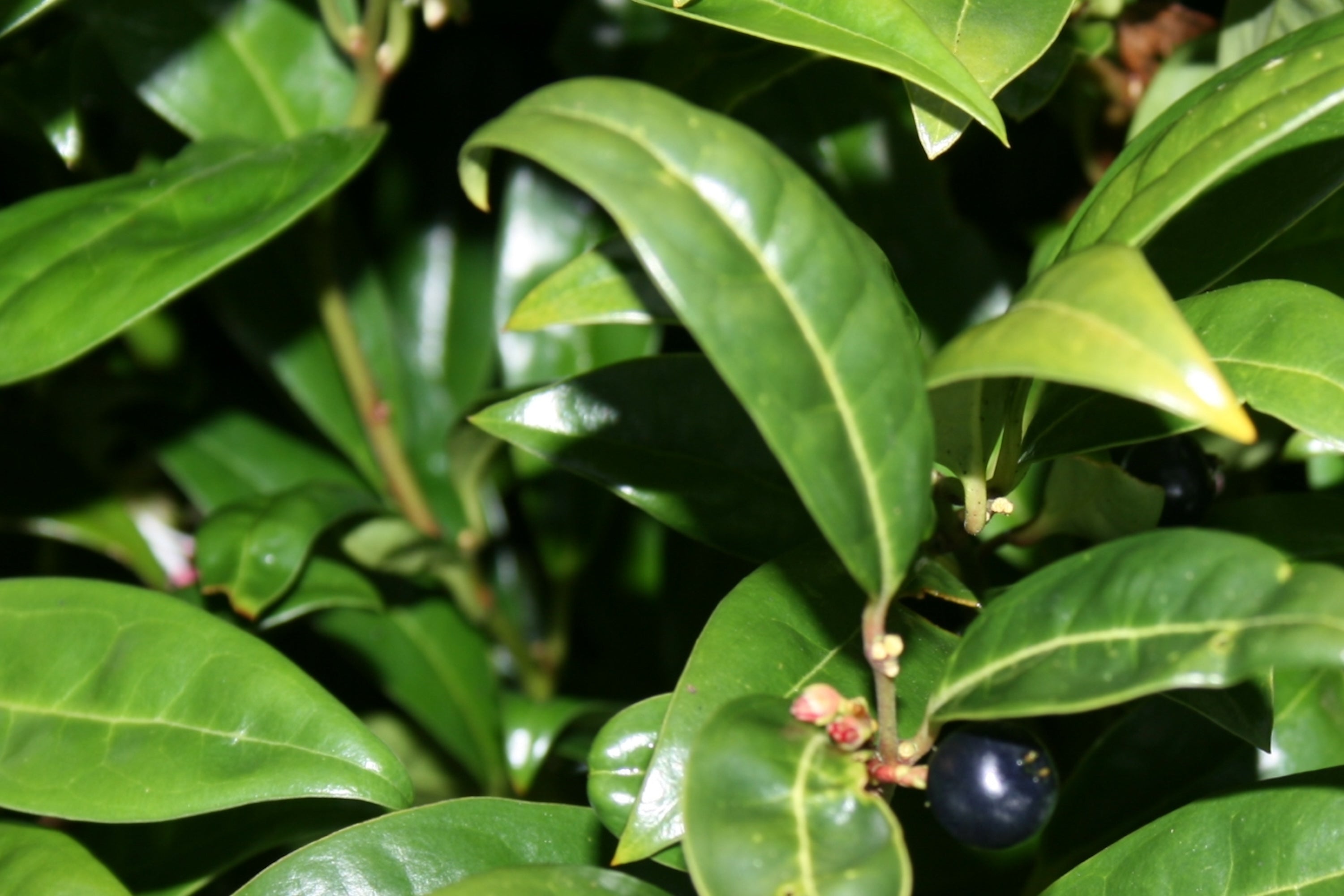 Sarcococca is a genus of 20 small, slow-growing, shrubby species from southeast Asia and the Himalayas that are closely related to boxwood. The major attraction of Sarcococca is the sweetly fragrant flowers in winter when little else is flowering. With such a sweet scent, you might expect that Sarcococca flowers are showy, but they are actually teeny tiny...almost unnoticeable. The flowers are often followed by gladdening glossy black berries