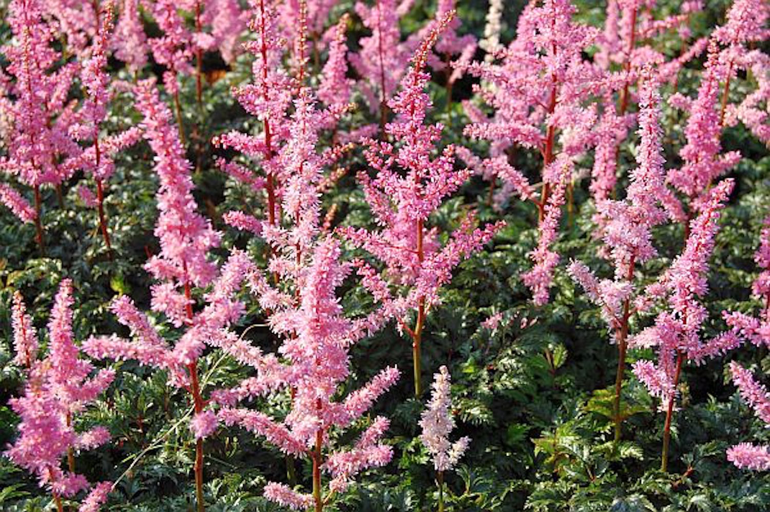 In and around summer time Astilbe provides a vibrant display of colour in the garden with brightly coloured, feathery flower spikey-plumes above attractive, deeply-cut foliage. Astilbe is one of those genus whose flowers also keep their structure when they dry out - giving you another 'season' of interest albeit in darker-browner hues. As a result they make a great cut flower and they are often found in florists.