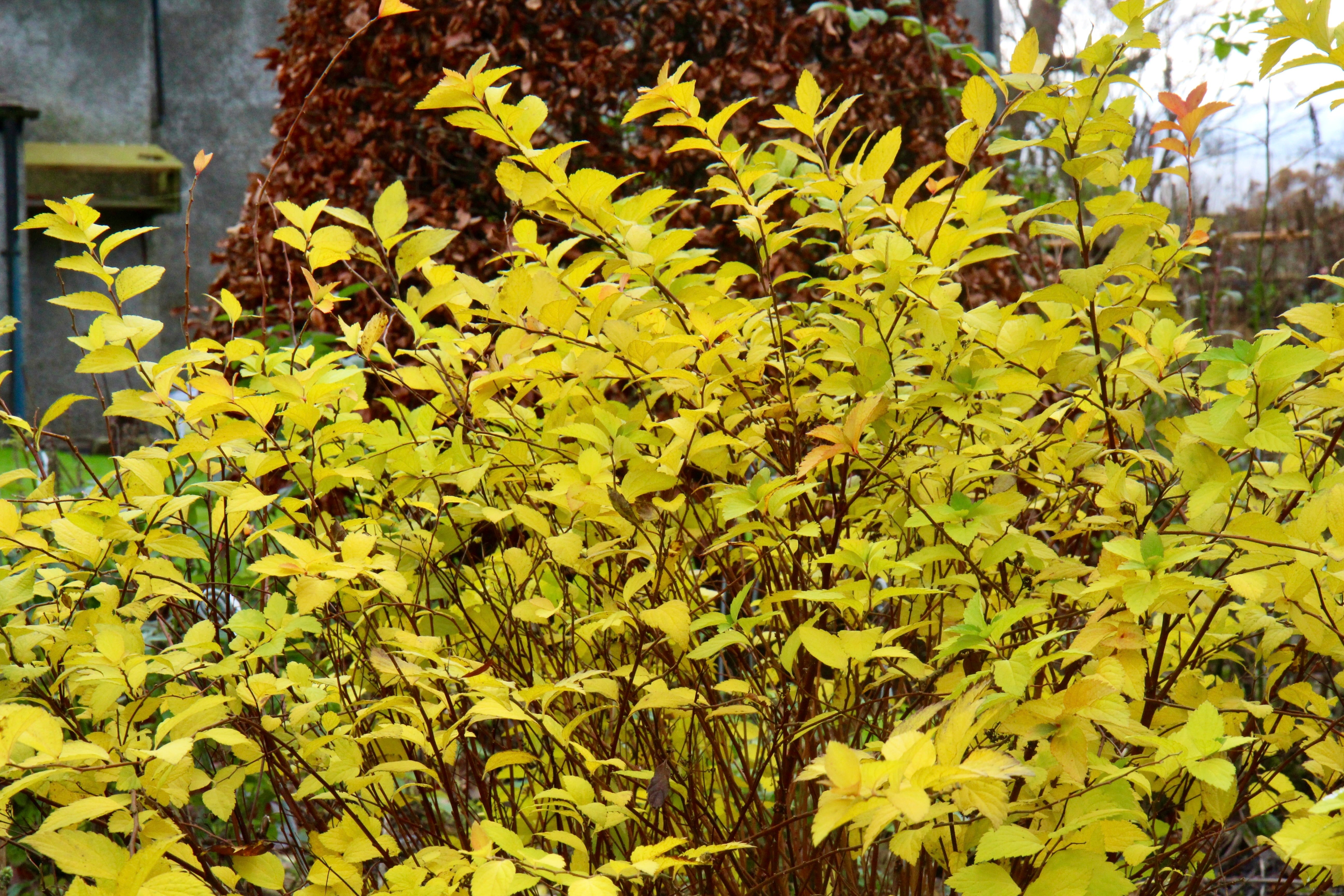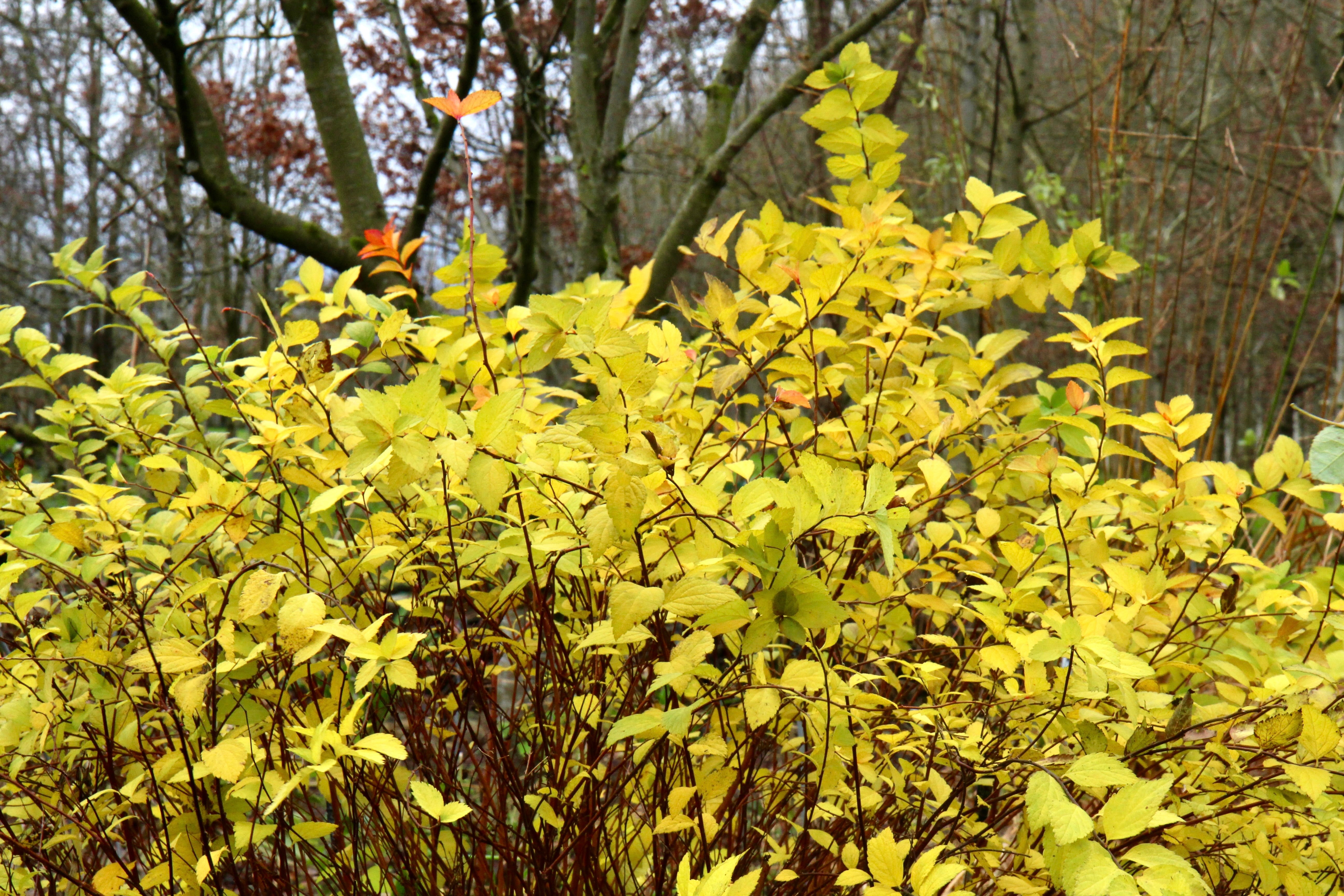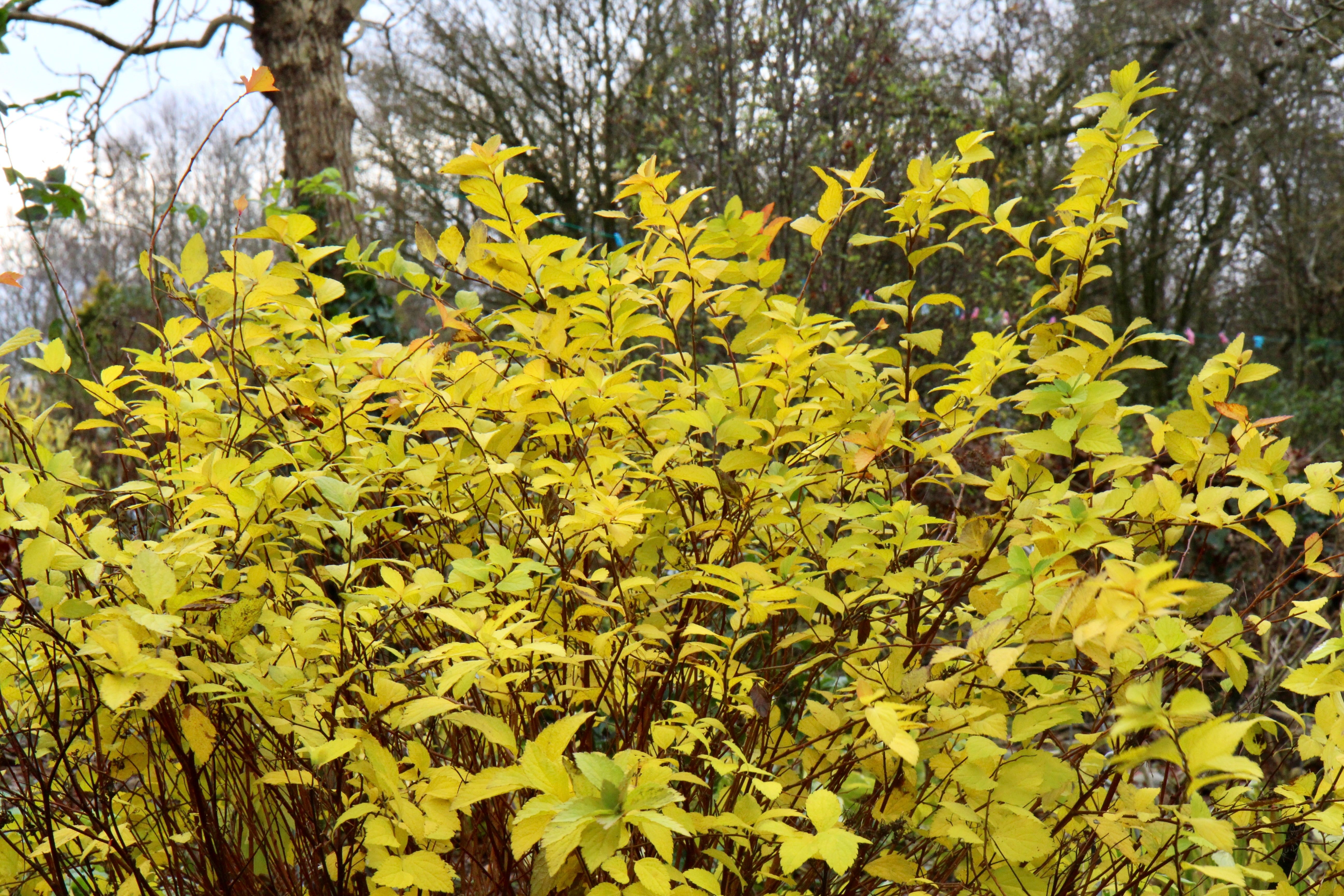Spiraea 'Olivia' is a lovely plant with leaves emerging almost orangish, turning green over the summer and leaving us with a burning bright yellow autumn colour.