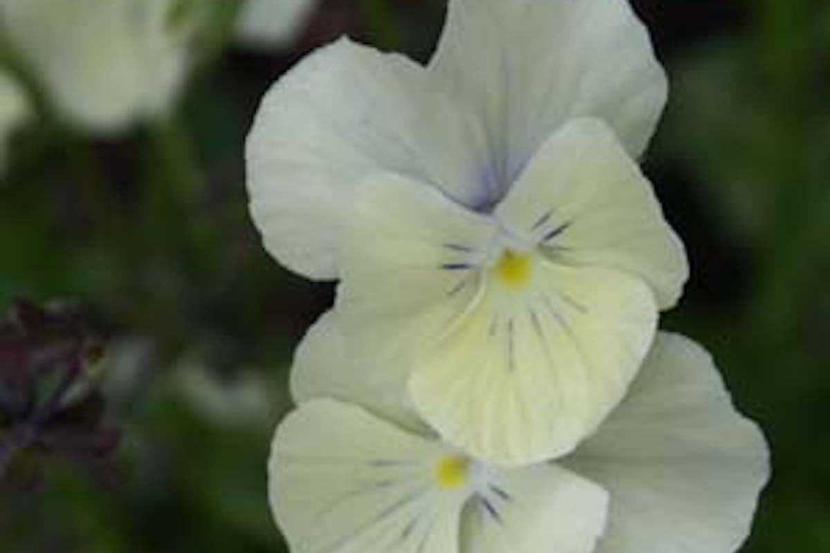 Viola cornuta 'Cleopatra' (C) is a compact, spreading, evergreen perennial with ovate, toothed, dark green leaves and, from spring to early autumn, fragrant, purple-flushed, creamy-white flowers with purple veins.
