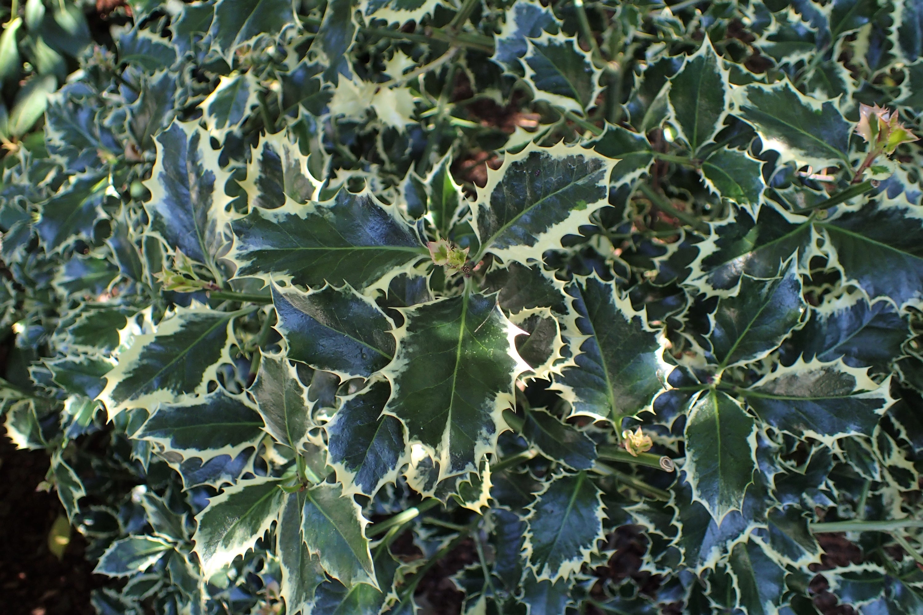 The leaves are spiny, glossy dark green with broad, creamy-yellow-white margins. Young foliage often exhibits a pinkish tinge, adding to its ornamental appeal. In late spring, ‘Silver Queen’ produces clusters of small, white flowers. Being a male cultivar, it serves as an effective pollinator for nearby female holly plants, facilitating berry production in those plants.