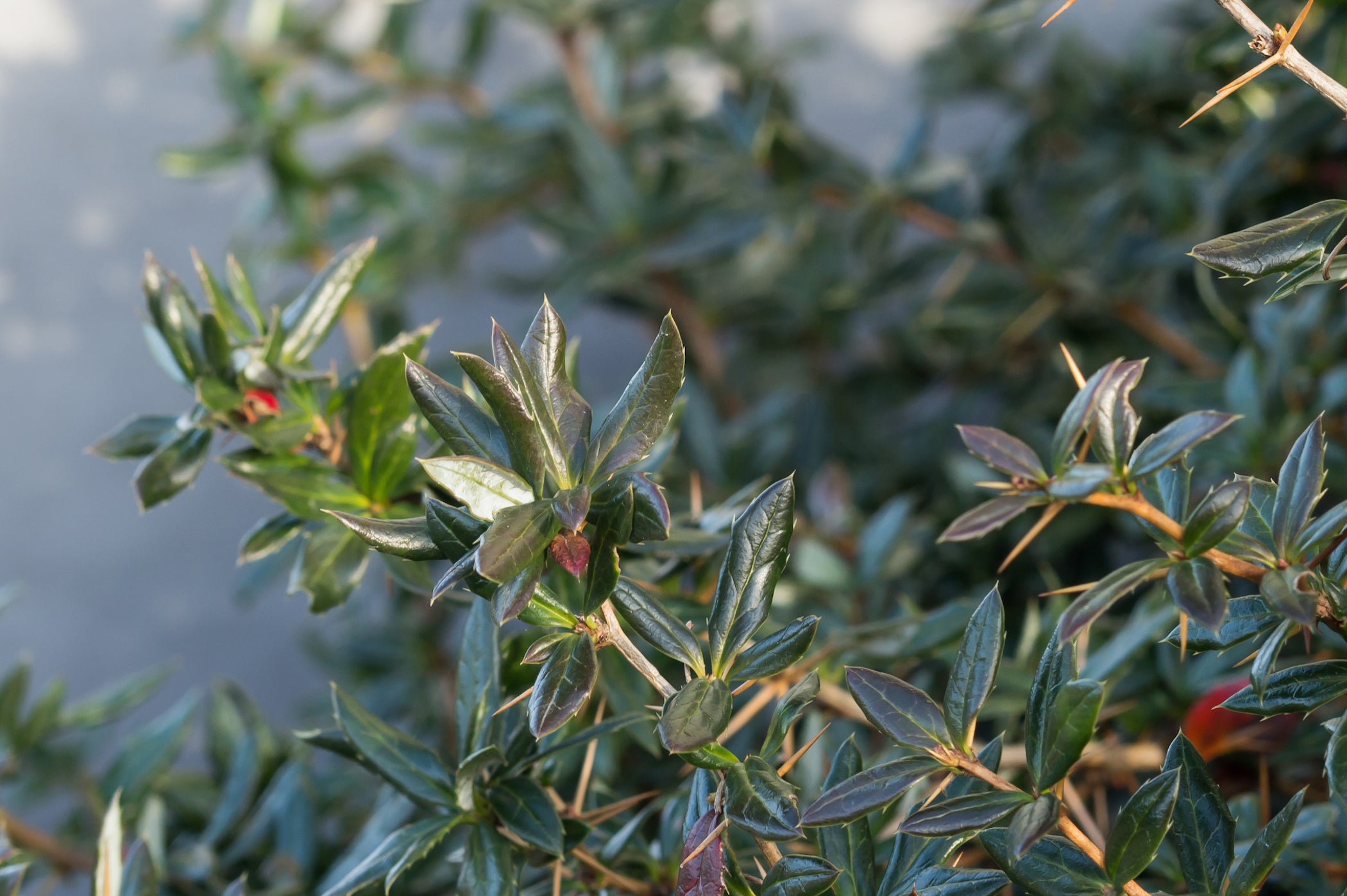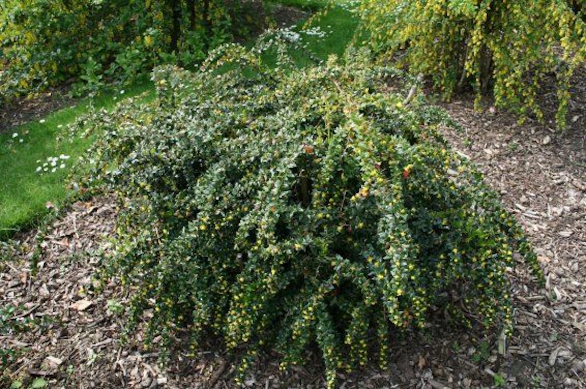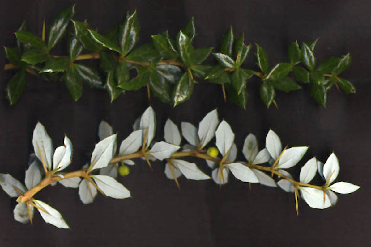 With yellow spines along the twigs the leaves are long, hard, leathery, glossy dark green above, vivid white below. In cold winter weather, the leaves may turn purplish-reddish-green above on exposed shoots. The flowers are small, yellow, and mature into dark purple berries. Has a lovely habit on its own if you ask me, but people often prune or grow it into a hedge or fence. It is prickly, so often used as a barrier plant. Will also grow almost anywhere from full sun to full shade.