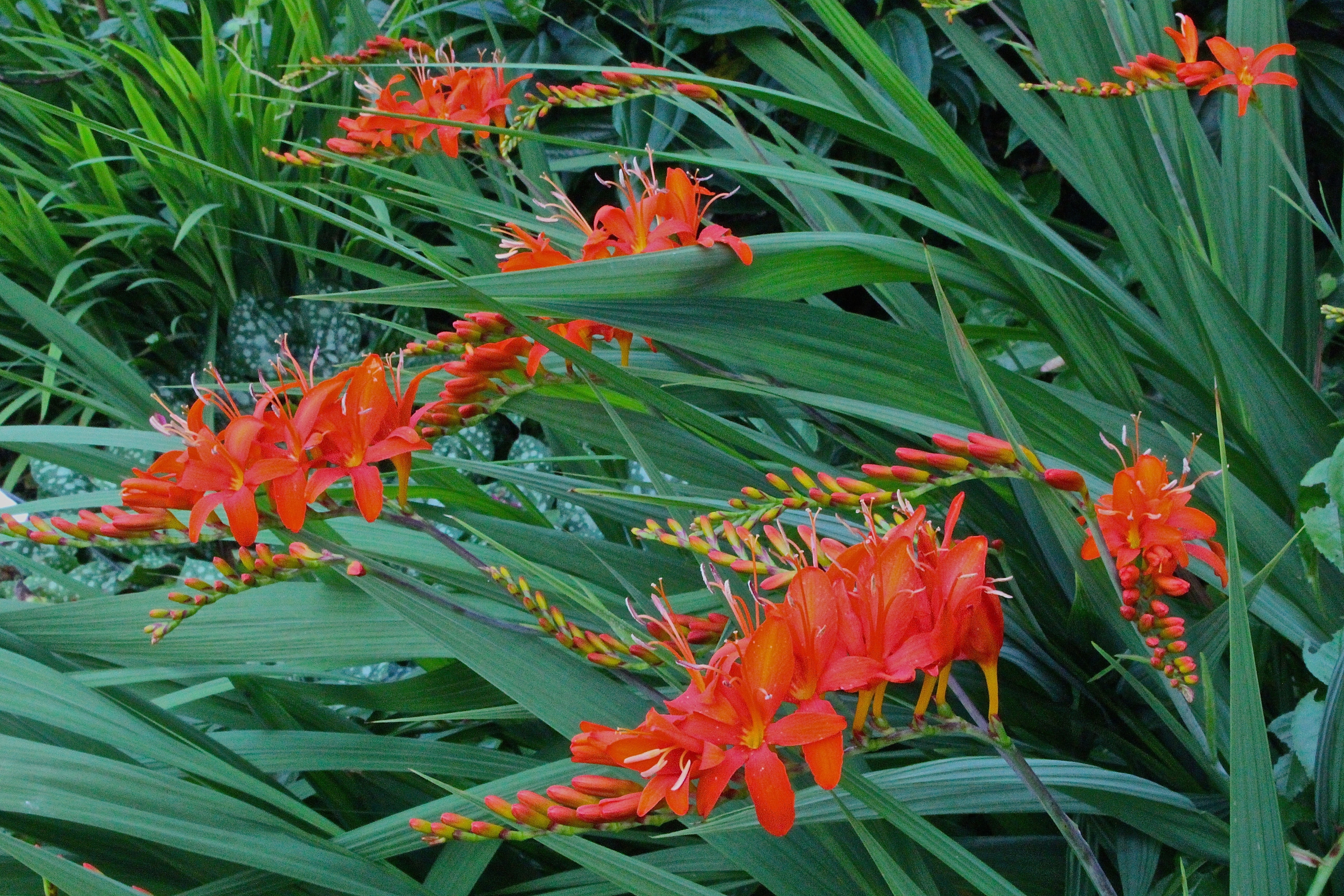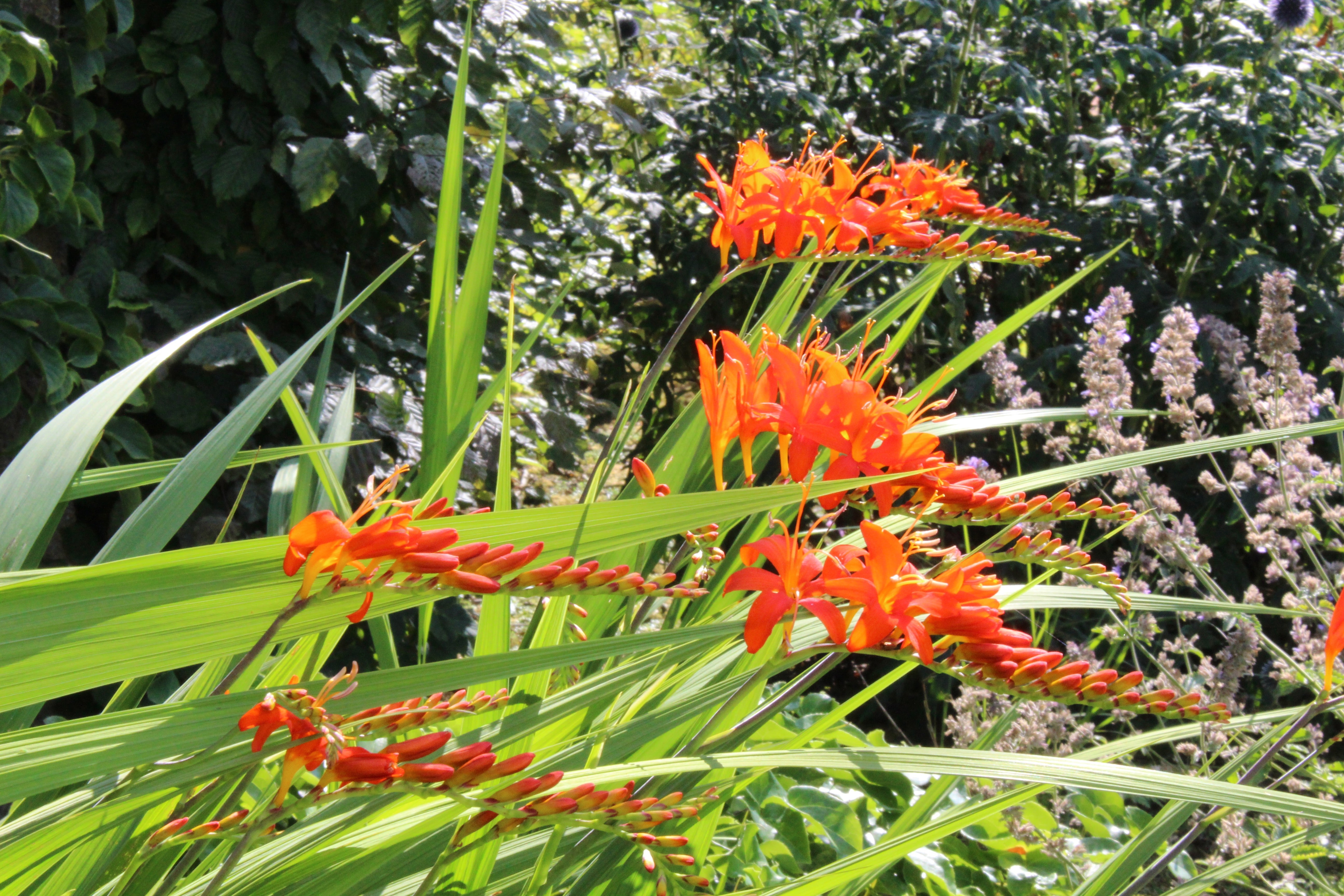 Crocosmia masoniorum 'Flamenco' if a lovely cultivar with subtle pure orange-red flowers that look up - unusual because Crocosmia are often hot and heavy. I believe we first got this easy-to-grow plant from the plantsman Gary Dunlop in Ballyrogan, County Down. I suspect it is another one of his wonderful introductions.