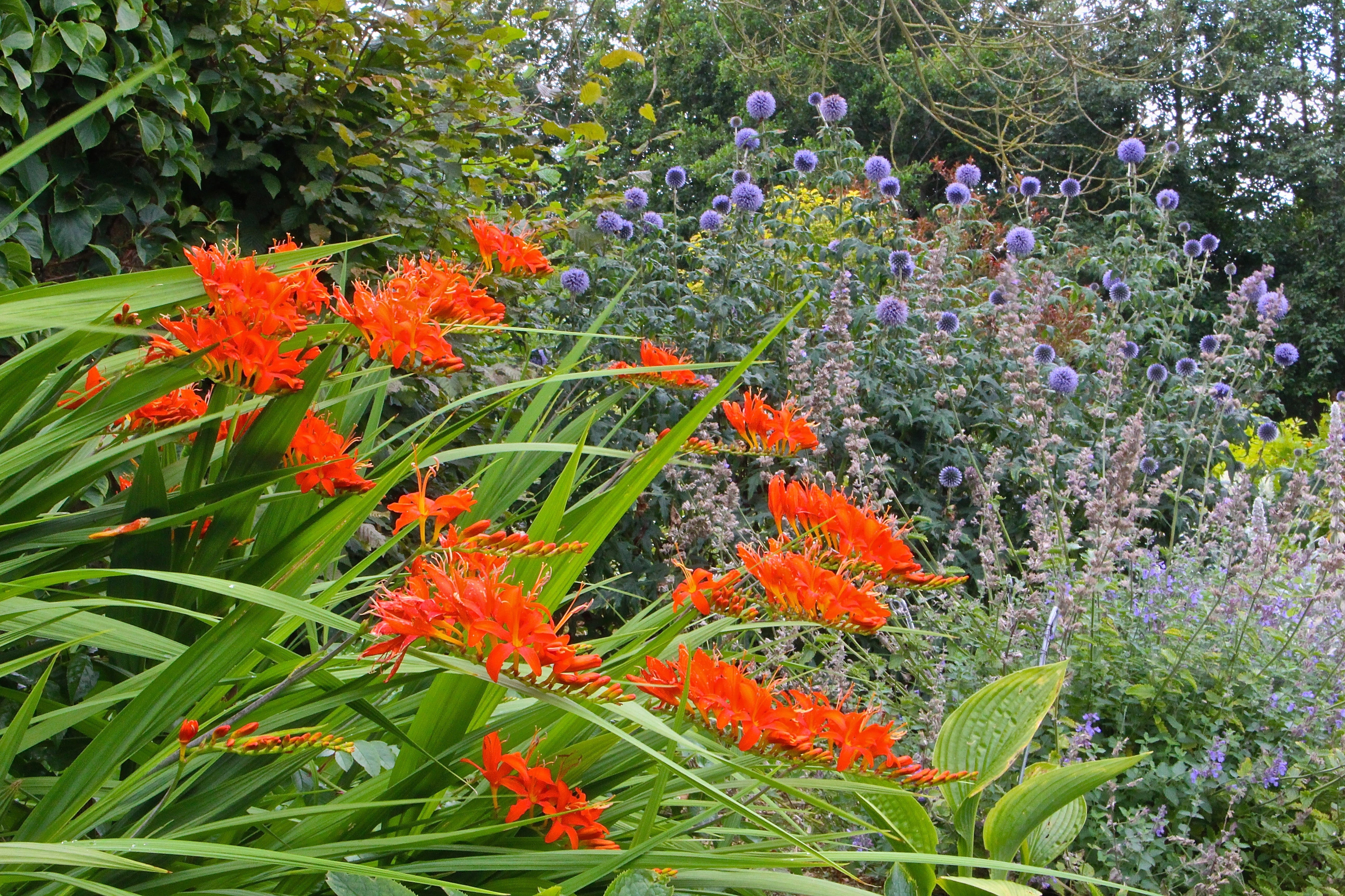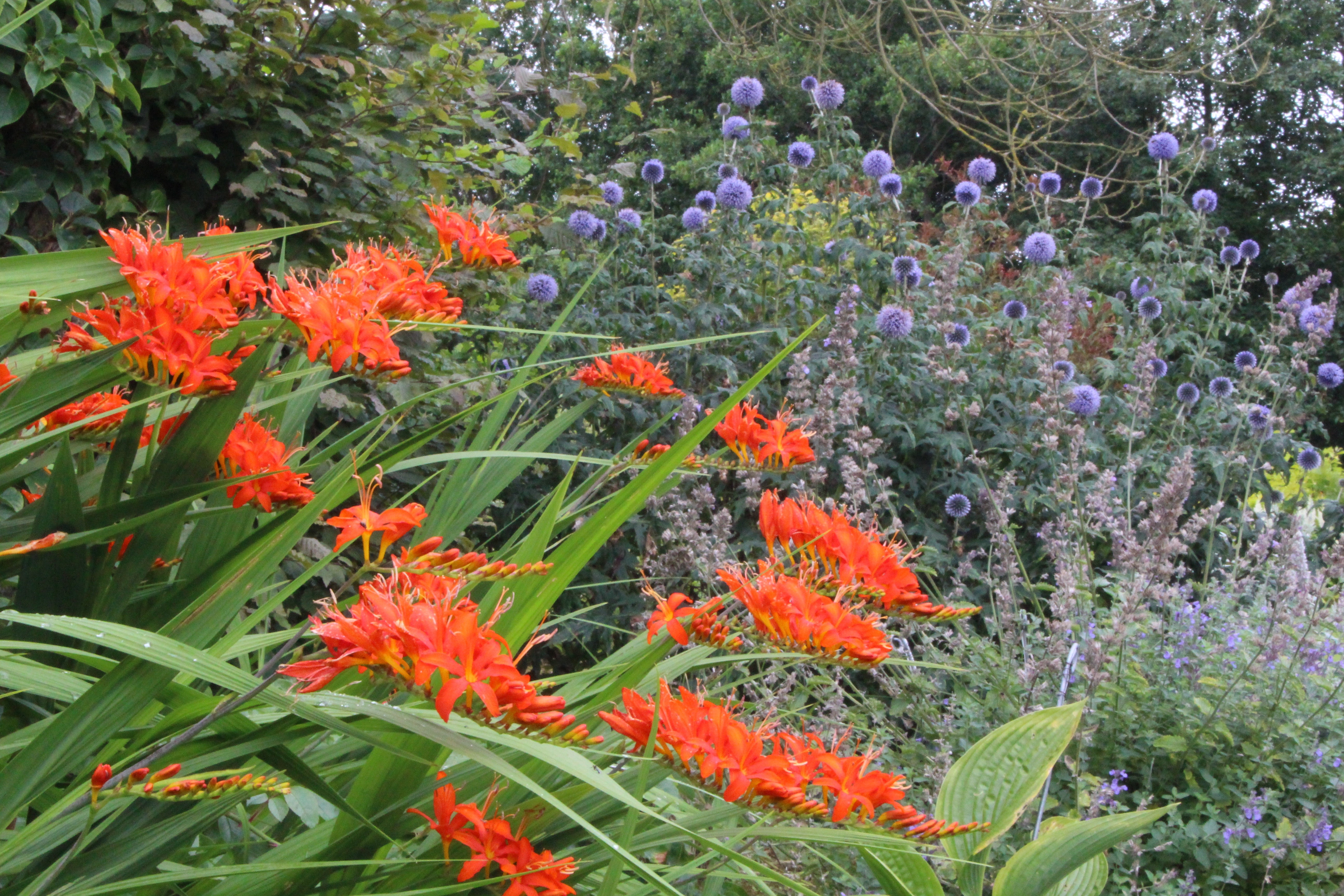 Crocosmia flowers are often 'hot' colours; deeply saturated with red, orange, and yellow hues. Colour therefore often dominates thinking when considering plant pairings. In our garden at Ballyrobert we have paired them with Ilex (Holly), grasses (such Stipa), Lavendula, Anemone, Rudbeckia, Agapanthus, and Aster; just take a look at our photos for each cultivar. If in doubt stick in the front of a border!