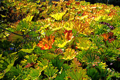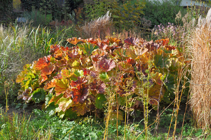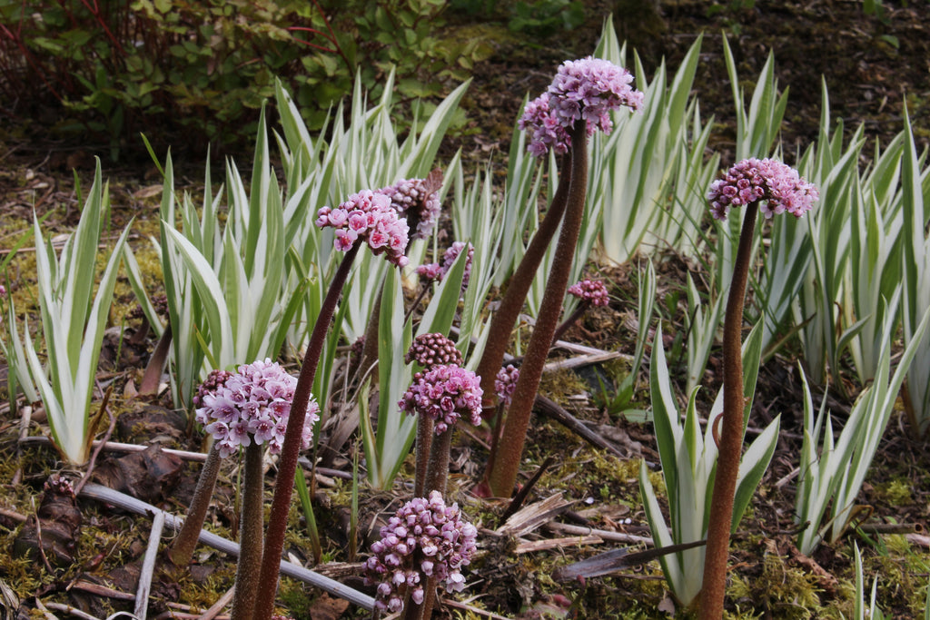 In gardens, Darmera flourishes in pond margins and bog gardens, where it forms an imposing upside down umbrella-like clump. It is suited to smaller gardens where there is no room for Gunnera manicata or Gunnera tinctoria, which are similar in appearance, but much larger and much harder to manage! I think of it as a mini-Gunnera. Needs wet soil though, or else the leaves will dry out.