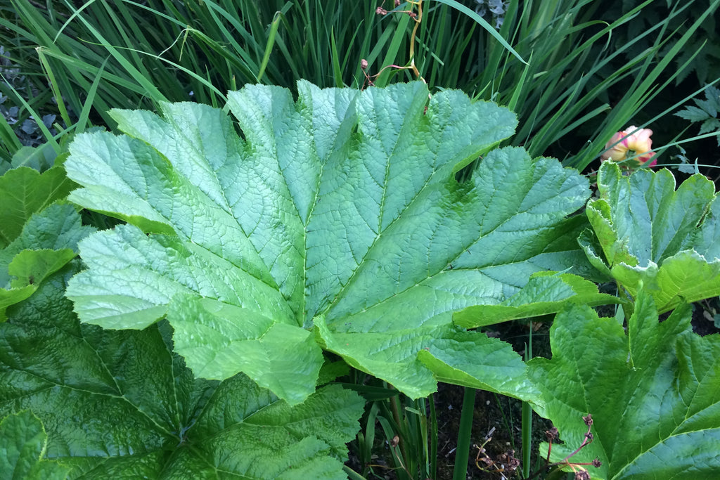 The species name is a reference to ‘pelt’ from the Greek 'Pelte' meaning shield and describes what is called a ‘peltate’ leaf arrangement. In a pelate arrangement the leaf stem is attached to roughly the centre of the leaf – nearly the same location as where a hand would grip a shield. The common name is umbrella plant or Indian Rhubarb (apparently the leaf stems are edible).