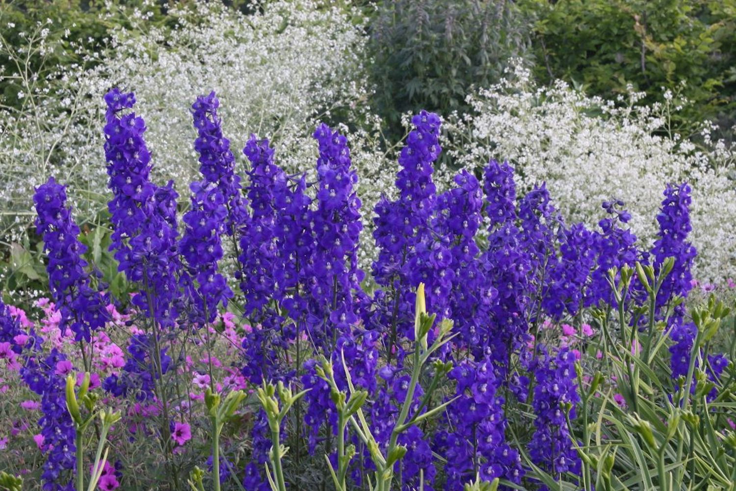 Delphinium (Belladonna Group) 'Atlantis' is shorter cultivar with single, dark blue flowers borne on branched racemes in early summer. Less likely to flop than other Delphiniums.