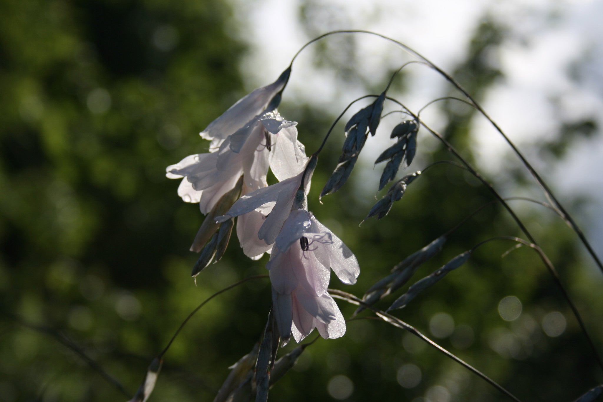 Dierama 'Guinevere' is a wonderfully beautiful cultivar. Tufts of grassy foliage send up masses of pure white flowers hanging from 'fishing rods'. Even on the calmest of days they sway back and forth in the breeze, as if the foliage is listening to some classical music!