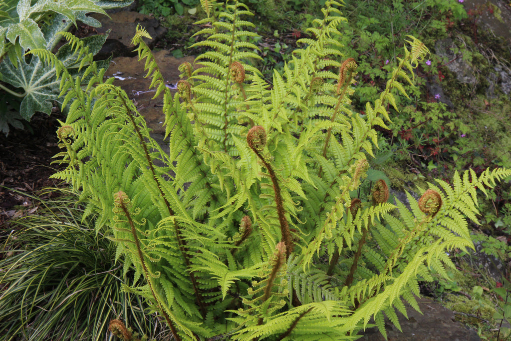 Dryopteris is a fern genus of 225 species from around the world that give us the majority of our great garden ferns. The genus name comes from the Greek words drys (tree) and pteris (fern) in possible reference to this fern's typical habitat in woodland areas. It is a good idea to put Dryopteris (male ferns) near Athyriums (lady ferns) for reasons that (I hope) are obvious.