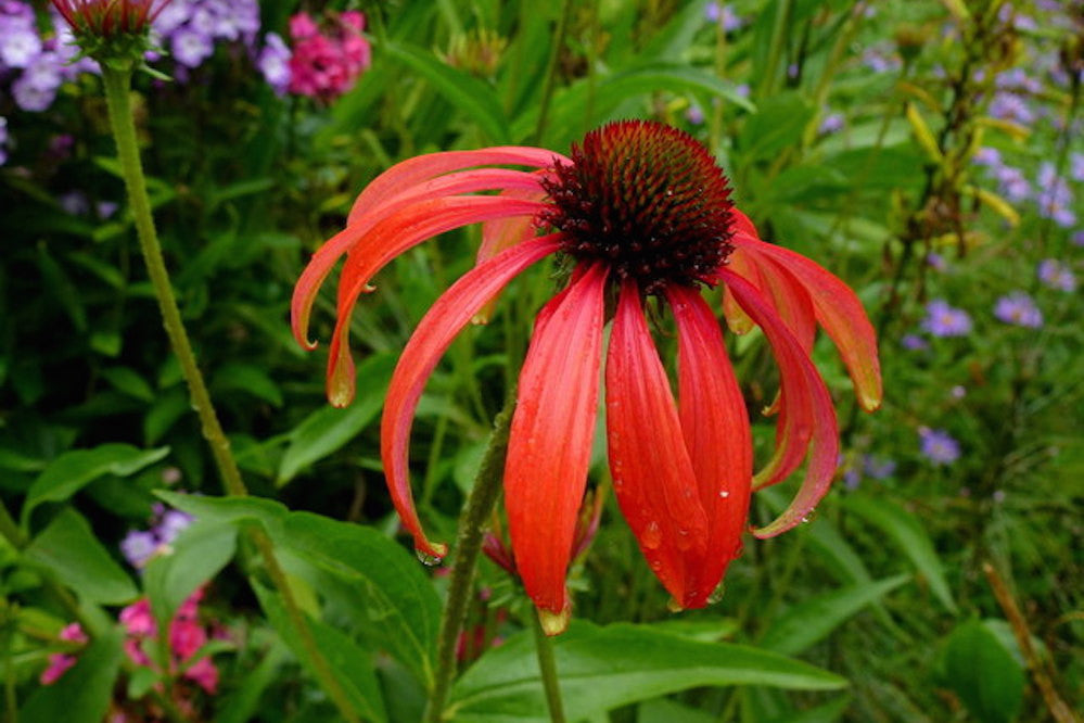 Echinacea 'Tomato Soup' is a 2007 introduction from Terra Nova nurseries in Oregon, USA. However it is a new one to us (2013) so we can't say with our usual confidence and experience that it will perform. However you buy this for the colour! So red! So wonderful! 2017 update: this is a poor performer in wet soils and will die if not well drained! - thats the risk you take...