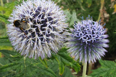 Echinops bannaticus 'Taplow Blue' is a robust, upright herbaceous perennial, with divided, prickly dark green leaves whitish beneath. Rounded, blue flower heads on branched, leafy stems. Insects love it and its taller height seems to make this fact all the more visible.