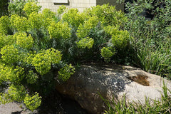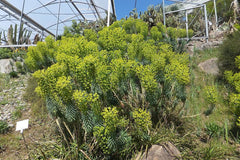 Euphorbia is a bold, technically evergreen perennial producing strong, upright or curving stems, densely-clothed with blue-green foliage. In their second spring the stems produce large, cylindrical clusters of yellow-green flowers with a dark red eye that last into summer. More likely semi-evergreen, I still think of it as a herbaceous perennial as you can (should?) cut back the old shoots/stems in spring.