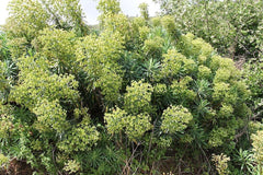 The species Euphorbia characias is an upright Euphorbia that is native to Southern Europe, the Balkans and Turkey. It typically grows (3-4ft, 90-120 cm) on erect, woody-based, green stems with narrow, linear to obovate, blue-green leaves spirally arranged along the stems. Each stem is topped in spring by a thick, bottlebrush-like inflorescense of greenish-yellow flowers. The flowers lack petals, but have showy, petal-like, greenish-yellow bracts. Watch out! Broken stems exude a white milky sap that is a skin irritant and poisonous.