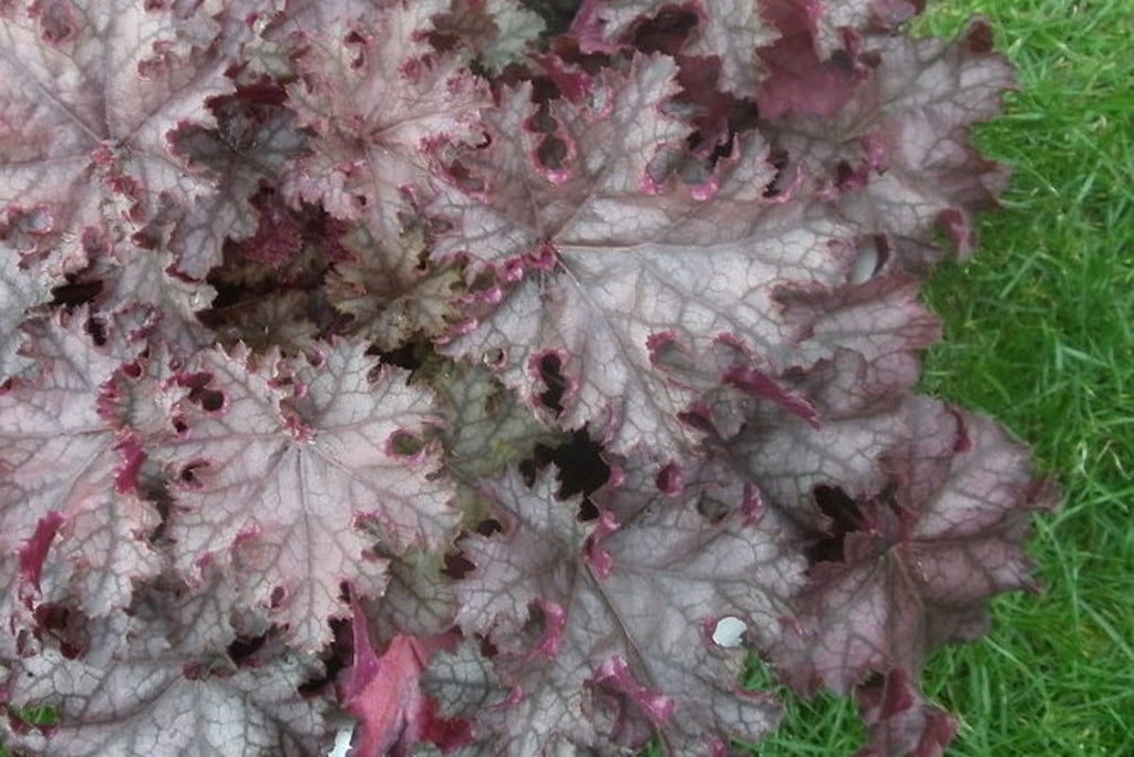 Heuchera have been very popular recently, probably because of the multitudes of new cultivars with exciting new leaf colours, variegation patterns, and leaf shapes. Modern heuchera leaf colours include green, chartreuse, yellow, peach, pinkish-red, copper and purple, and every shade in between. Coral Bell leaves are often patterned with contrasting leaf veins in silver, or in a darker shade than the main leaf colour. With so many different foliage variations to choose from it is interesting to think that Heuchera were originally grown for their flowers, Although modern breeders of landscape Heucheras have not focused on the flowers, they are still quite attractive...clusters of dozens of tiny bell-like flowers at the end of a tall wiry stalk during the summer.