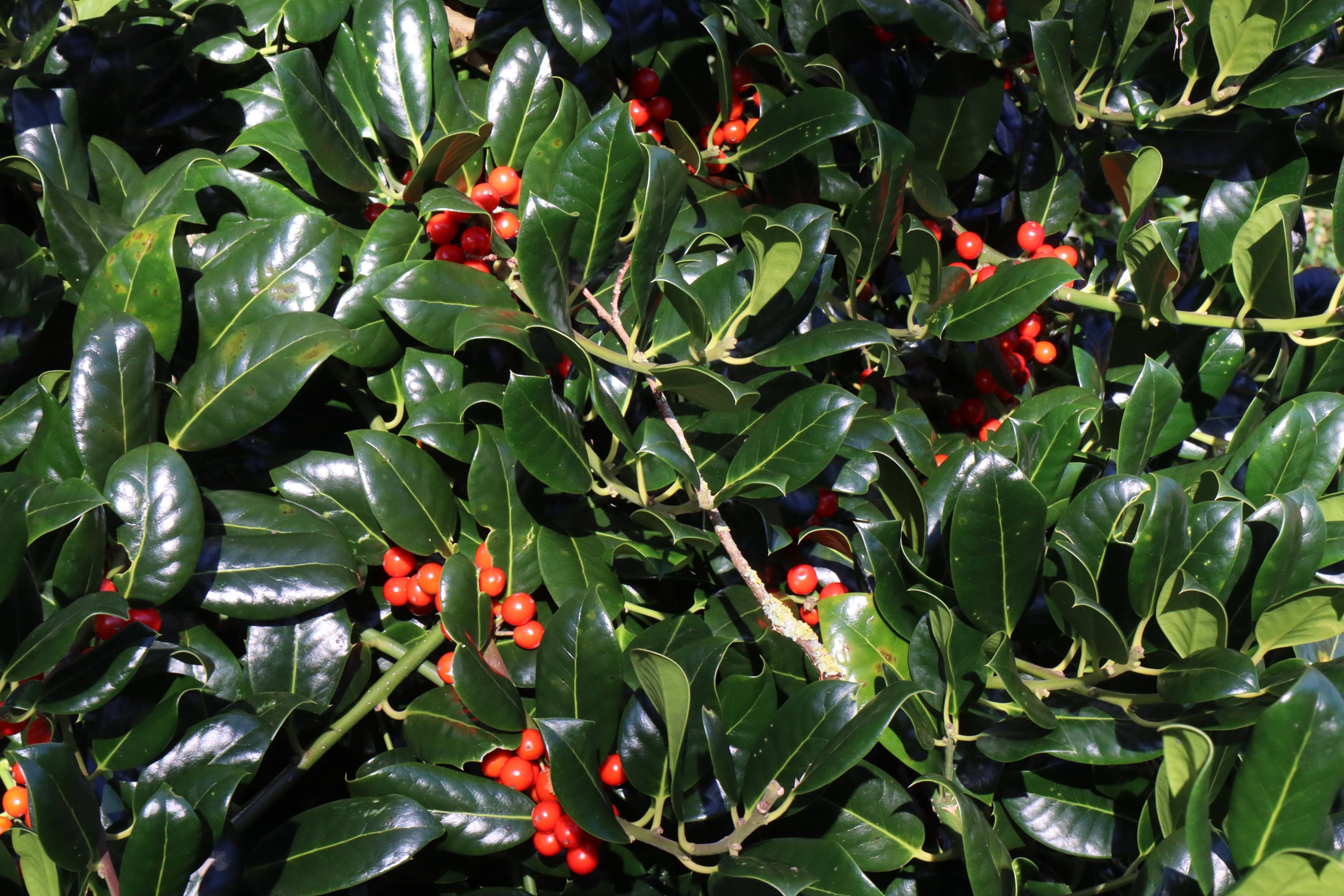 IIlex aquifolium ‘J.C. van Tol’ is a self-fertile female holly cultivar known for its almost spineless, glossy dark green leaves and abundant bright red berries. It has received the Royal Horticultural Society’s (RHS) Award of Garden Merit (AGM), indicating its excellence for garden use. Berry good....