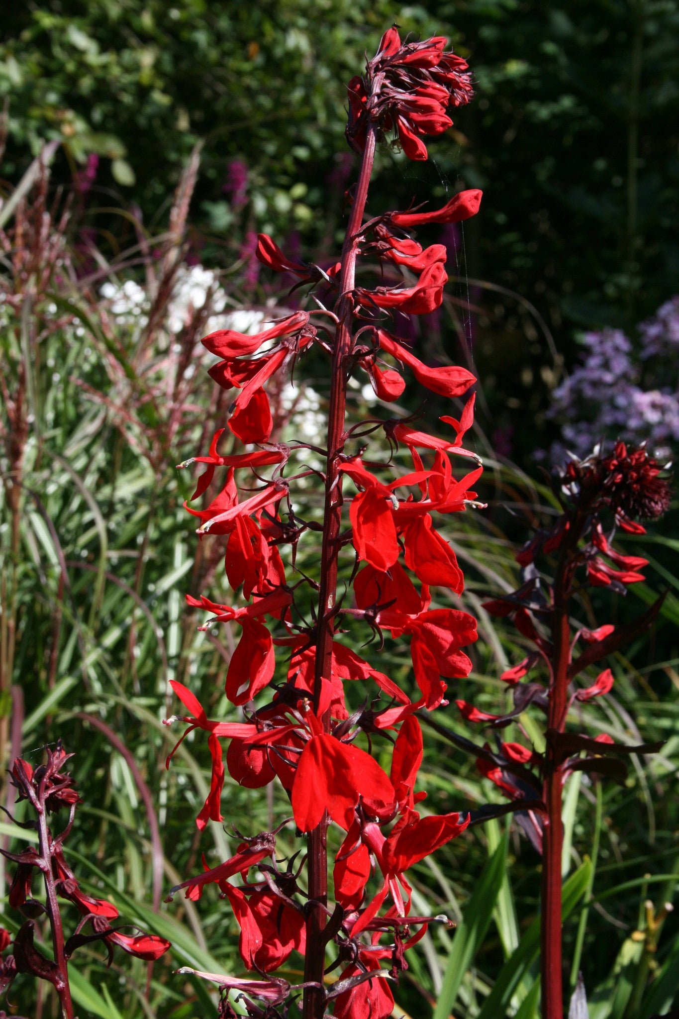 Lobelia cardinalis 'Queen Victoria' provides stunning spikes of scarlet flowers among beautiful, beetroot-coloured foliage. Use it to fill gaps left by early flowering plants or add to a hot border. Does well near ponds or streams. Received a Royal Horticultural Society Award of Garden Merit in 1993.
