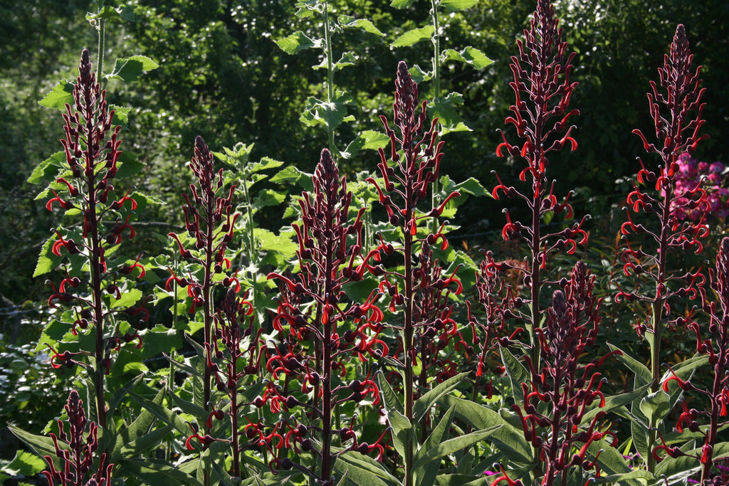 Lobelia prefers damp soils and in the wild is often seen growing in boggy places like swamps in sun or part shade. The flowering stalks of Lobelia arise from flat green winter rosettes and provide rich jewel tones of red, pink, blue and more. Lobelia flowers generally begin forming in midsummer on tall stalks and may last into autumn. It is a tough, low maintenance plant which makes it perfect for wet gardens.