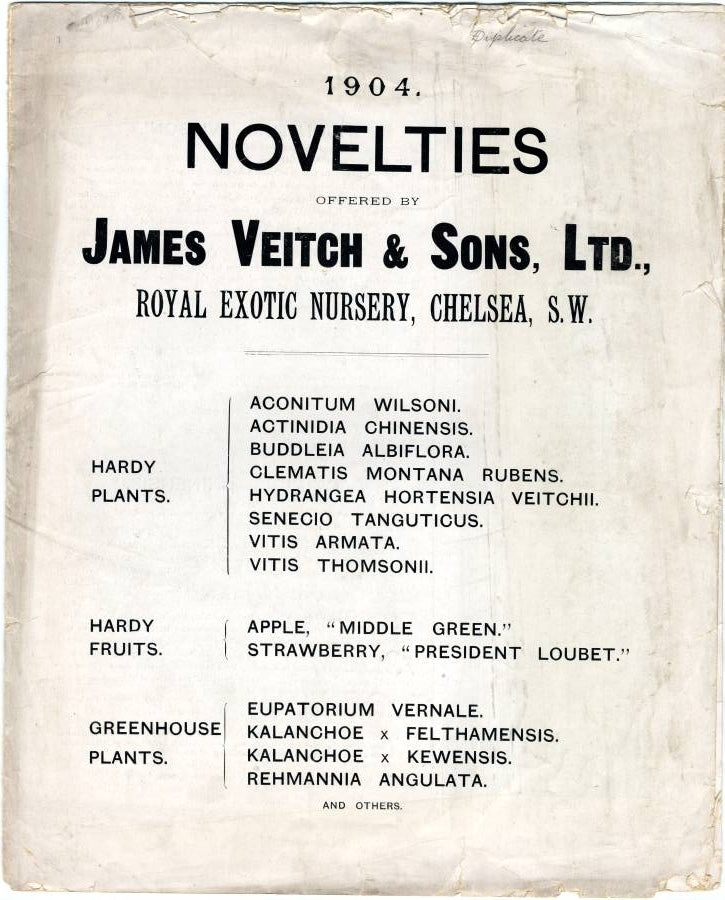 The Veitch Nurseries were started by John Veitch sometime before 1808. The firm had, by the outbreak of the First World War, introduced 1281 plants into cultivation, which were either previously unknown or newly-bred varieties (see cultivars). These included 498 greenhouse plants, 232 orchids, 153 deciduous trees, shrubs and climbing plants, 122 herbaceous plants, 118 exotic ferns, 72 evergreen and climbing plants, 49 conifers, and 37 ornamental bulbous plants.