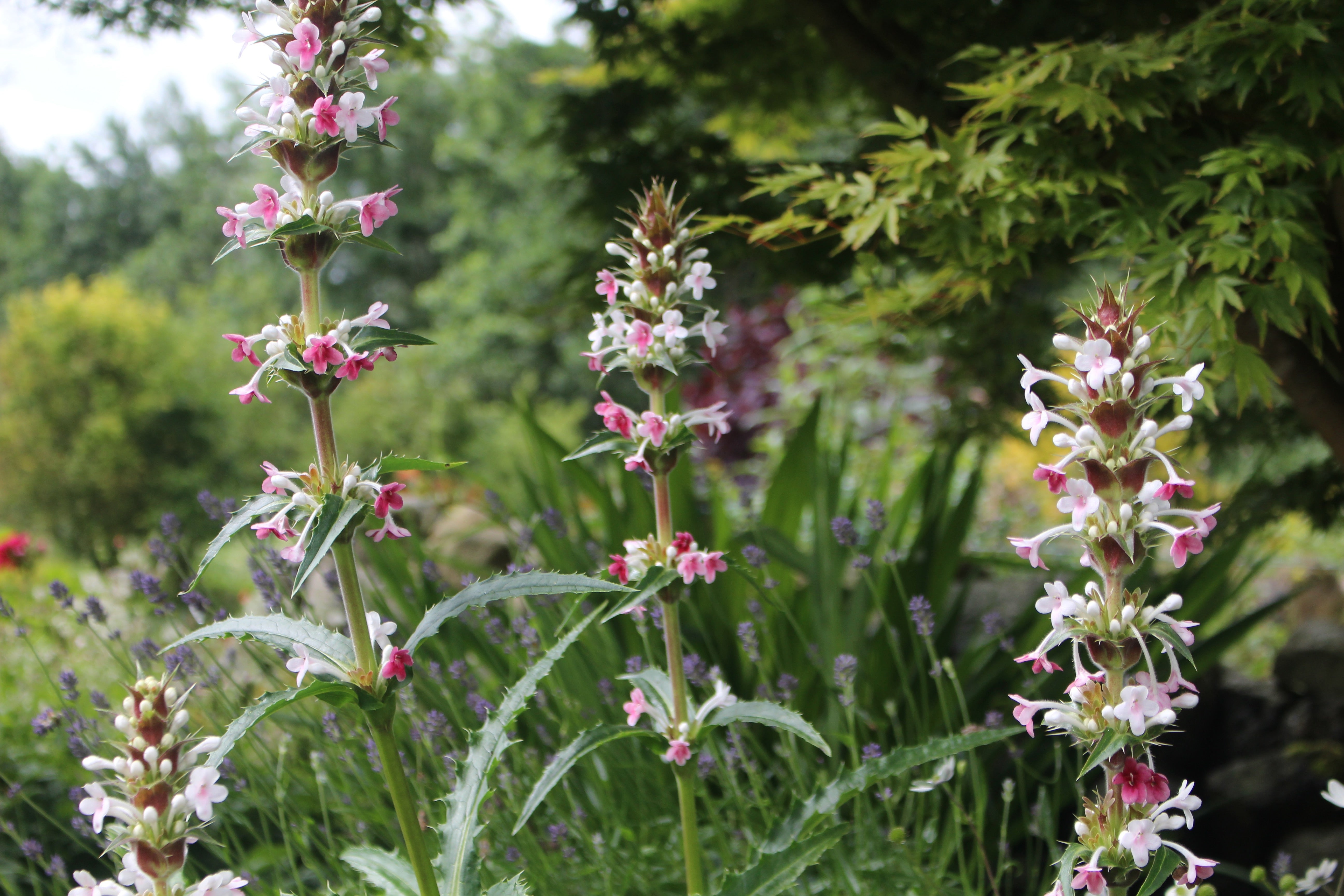 Morina longifolia is Himalayan native is full of delicacy and strength. Its prickly, aromatic foliage appears beneath pagodalike towers of jade green buds and white tubular florets. As the bees pollinate the flowers, they initially turn pink and then red, so by late summer it is possible to have pink, red and white flowers on the same elegant spike. The dark green, spiny-edged foliage is attractive too. When the blossoms are spent, the standing green stems are perfect for dried arrangements.