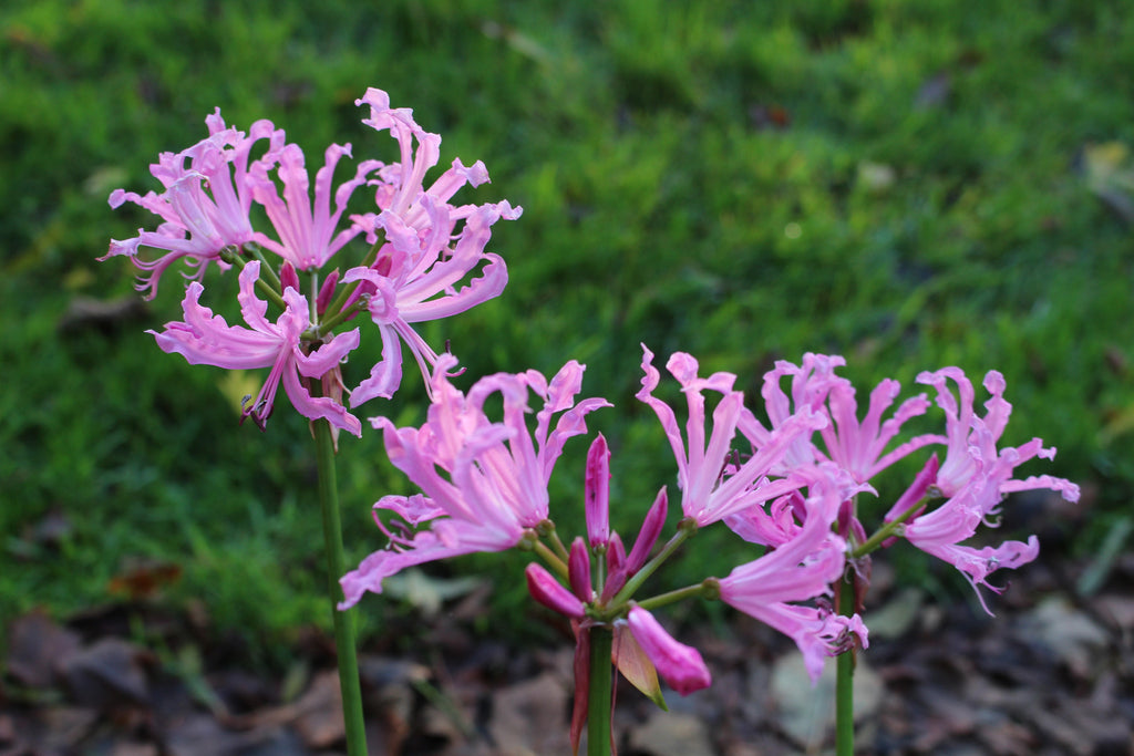 In late autumn most Nerine bear spherical umbels of lily-like flowers in shades from white through pink to crimson. They are bulbous perennials, some evergreen, associated with rocky and arid habitats. However we grow them almost everywhere in our damp clay soil in our garden at Ballyrobert. Classic companion are Colchicums and Cyclamens. Do try them contrasted with different foliage though (try Hakonechloa) - to bring a bit of summer into your late autumn/winter garden!