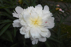 Paeonia lactiflora 'Duchesse de Nemours' is an old standard that features large, very fragrant, double flowers (white bombs) with cupped, white guard petals and dense light yellow centres. Blooms in late mid-season. Glossy green foliage is divided into oval to lance-shaped leaflets. Has the RHS AGM and makes an excellent cut flower.