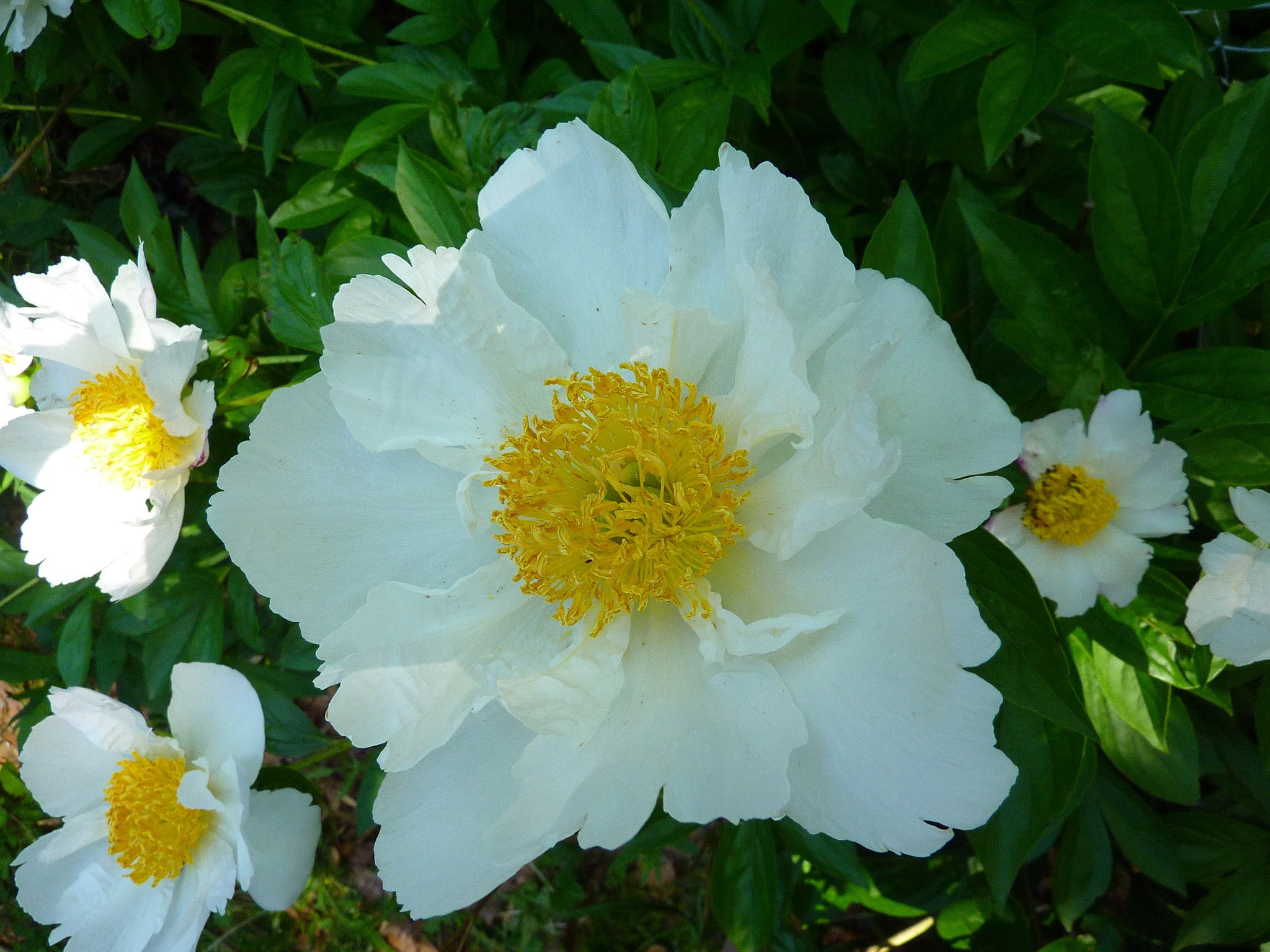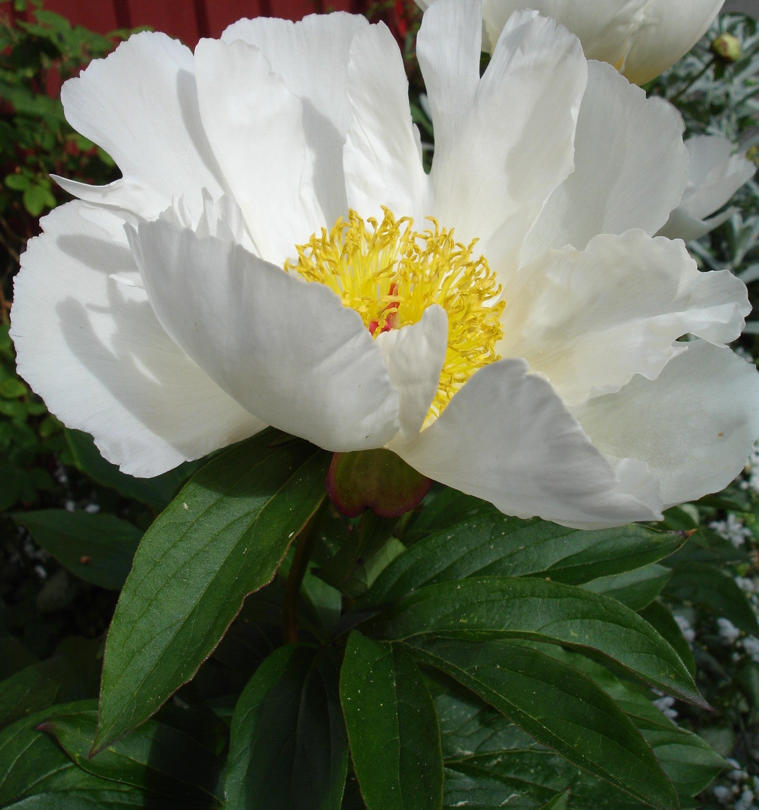 Paeonia lactiflora 'White Wings' was introduced by Hoogendoorn in 1949. It has very large flowers,; buds open with purple streaks on the outside that quickly fade to pure white; nice centre of deep yellow stamens; leaves are a dark, glossy green; has nice, sturdy stems. Another classic!