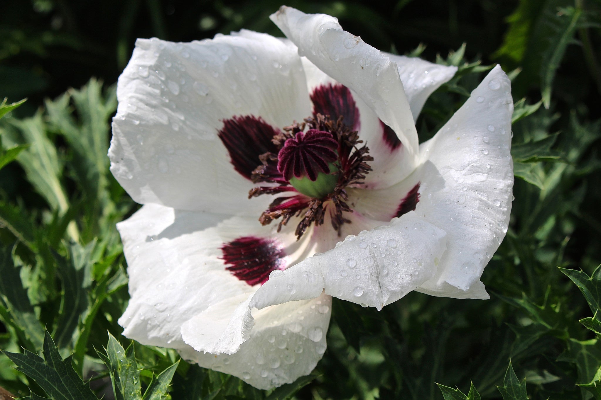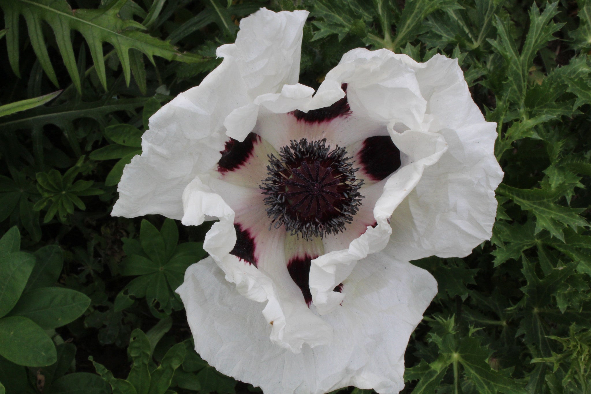 Papaver orientale 'Royal Wedding' is a 1996 introduction that is actually quite new to us - but we love it so far. In a tribute to its name, the extravagant, deeply cupped flowers flaunt satiny white silken-thin petals waltzing around a plush purple-black brocaded center. All this floral finery dresses a bluish green pedestal of fuzzy fernlike leaves that grows weary during the summer but bounces back for a pleasing winter presence.