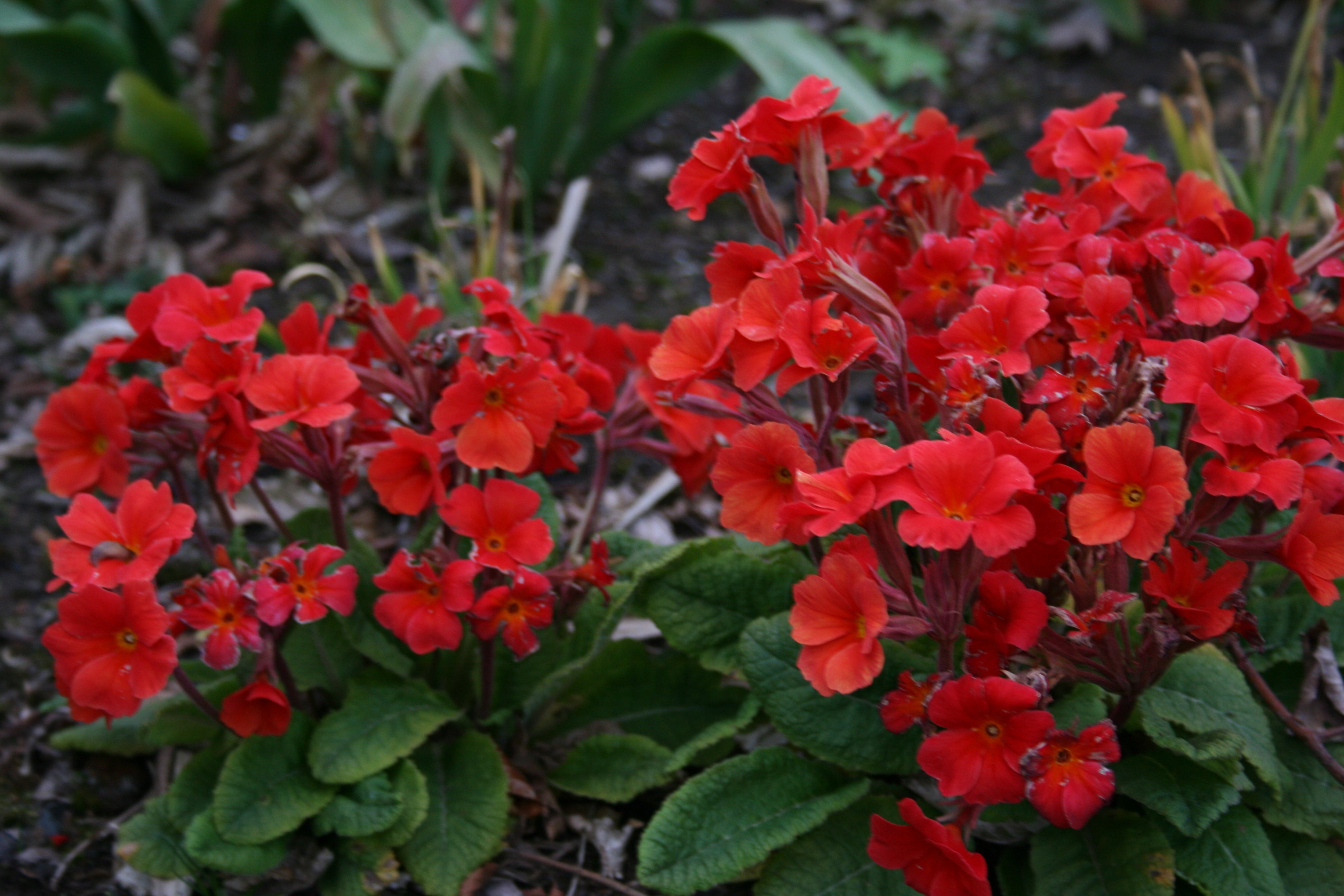 Primula 'Don Keefe' (Pr/poly) is, depending on the light, a red to orange semi-evergreen perennial. Don't know much else about this apart from I like it!